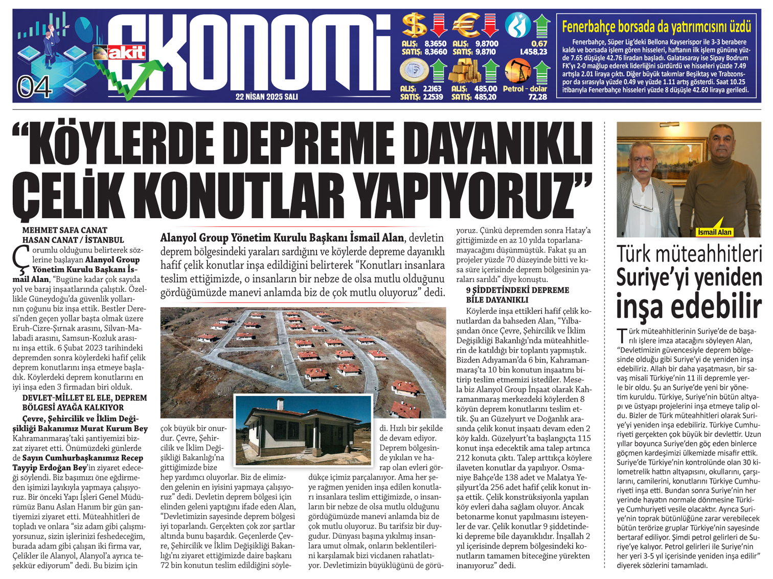 Alanyol Group Yönetim Kurulu Başkanı İsmail Alan, devletin deprem bölgesindeki yaraları sardığını ve köylerde depreme dayanıklı hafif çelik konutlar inşa edildiğini belirterek "Konutları insanlara teslim ettiğimizde, o insanların bir nebze de olsa mutlu olduğunu gördüğümüzde manevi anlamda biz de çok mutlu oluyoruz" dedi.