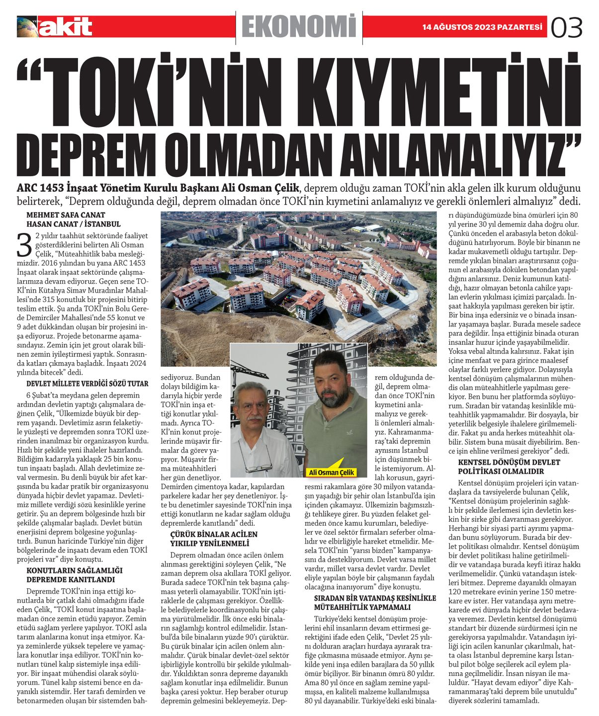 "TOKİ'nin kıymetini deprem olmadan anlamalıyız" Yeni Akit Gazetesi / 14.08.2023 ARC 1453 İnşaat Yönetim Kurulu Başkanı Ali Osman Çelik, deprem olduğu zaman TOKİ'nin akla gelen ilk kurum olduğunu belirterek, "Deprem olduğunda değil, deprem olmadan önce TOKİ'nin kıymetini anlamalıyız ve gerekli önlemleri almalıyız" dedi. 32 yıldır taahhüt sektöründe faaliyet gösterdiklerini belirten Ali Osman Çelik, "Müteahhitlik baba mesleğimizdir. 2016 yılından bu yana ARC 1453 İnşaat olarak inşaat sektöründe çalışmalarımıza devam ediyoruz. Geçen sene TOKİ'nin Kütahya Simav Muradınlar Mahallesi'nde 315 konutluk bir projesini bitirip teslim ettik. Şu anda TOKİ'nin Bolu Gerede Demirciler Mahallesi'nde 55 konut ve 9 adet dükkândan oluşan bir projesini inşa ediyoruz. Projede betonarme aşamasındayız. Zemin için jet grout olarak bilinen zemin iyileştirmesi yaptık. Sonrasında katları çıkmaya başladık. İnşaatı 2024 yılında bitecek" dedi. Devlet millete verdiği sözü tutar 6 Şubat'ta meydana gelen depremin ardından devletin yaptığı çalışmalara değinen Çelik, "Ülkemizde büyük bir deprem yaşandı. Devletimiz asrın felaketiyle yüzleşti ve depremden sonra TOKİ üzerinden inanılmaz bir organizasyon kurdu. Hızlı bir şekilde yeni ihaleler hazırlandı. Bildiğim kadarıyla yaklaşık 25 bin konutun inşaatı başladı. Allah devletimize zeval vermesin. Bu denli büyük bir afet karşısında bu kadar pratik bir organizasyonu dünyada hiçbir devlet yapamaz. Devletimiz millete verdiği sözü kesinlikle yerine getirir. Şu an deprem bölgesinde hızlı bir şekilde çalışmalar başladı. Devlet bütün enerjisini deprem bölgesine yoğunlaştırdı. Bunun haricinde Türkiye'nin diğer bölgelerinde de inşaatı devam eden TOKİ projeleri var" diye konuştu. Konutların sağlamlığı depremde kanıtlandı Depremde TOKİ'nin inşa ettiği konutlarda bir çatlak dahi olmadığını ifade eden Çelik, "TOKİ konut inşaatına başlamadan önce zemin etüdü yapıyor. Zemin etüdü sağlam yerlere yapılıyor. TOKİ asla tarım alanlarına konut inşa etmiyor. Kaya zeminlerde yüksek tepelere ve yamaçlara konutlar inşa ediliyor. TOKİ'nin konutları tünel kalıp sistemiyle inşa ediliyor. Bir inşaat mühendisi olarak söylüyorum. Tünel kalıp sistemi bence en dayanıklı sistemdir. Her tarafı demirden ve betonarmeden oluşan bir sistemden bahsediyoruz. Bundan dolayı bildiğim kadarıyla hiçbir yerde TOKİ'nin inşa ettiği konutlar yıkılmadı. Ayrıca TOKİ'nin konut projelerinde müşavir firmalar da görev yapıyor. Müşavir firma müteahhitleri her gün denetliyor. Demirden çimentoya kadar, kapılardan parkelere kadar her şey denetleniyor. İşte bu denetimler sayesinde TOKİ'nin inşa ettiği konutların ne kadar sağlam olduğu depremlerde kanıtlandı" dedi. Çürük binalar acilen yıkılıp yenilenmeli Deprem olmadan önce acilen önlem alınması gerektiğini söyleyen Çelik, "Ne zaman deprem olsa akıllara TOKİ geliyor. Burada sadece TOKİ'nin tek başına çalışması yeterli olamayabilir. TOKİ'nin iştiraklerle de çalışması gerekiyor. Özellikle belediyelerle koordinasyonlu bir çalışma yürütülmelidir. İlk önce eski binaların sağlamlığı kontrol edilmelidir. İstanbul'da bile binaların yüzde 90'ı çürüktür. Bu çürük binalar için acilen önlem alınmalıdır. Çürük binalar devlet-özel sektör işbirliğiyle kontrollü bir şekilde yıkılmalıdır. Yıkıldıktan sonra depreme dayanıklı sağlam konutlar inşa edilmelidir. Bunun başka çaresi yoktur. Hep beraber oturup depremin gelmesini bekleyemeyiz. Deprem olduğunda değil, deprem olmadan önce TOKİ'nin kıymetini anlamalıyız ve gerekli önlemleri almalıyız. Kahramanmaraş'taki depremin aynısını İstanbul için düşünmek bile istemiyorum. Allah korusun, gayriresmi rakamlara göre 30 milyon vatandaşın yaşadığı bir şehir olan İstanbul'da işin içinden çıkamayız. Ülkemizin bağımsızlığı tehlikeye girer. Bu yüzden felaket gelmeden önce kamu kurumları, belediyeler ve özel sektör firmaları seferber olmalıdır ve elbirliğiyle hareket etmelidir. Mesela TOKİ'nin "yarısı bizden" kampanyasını da destekliyorum. Devlet varsa millet vardır, millet varsa devlet vardır. Devlet eliyle yapılan böyle bir çalışmanın faydalı olacağına inanıyorum" diye konuştu. Sıradan bir vatandaş kesinlikle müteahhitlik yapmamalı Türkiye'deki kentsel dönüşüm projelerini ehil insanların devam ettirmesi gerektiğini ifade eden Çelik, "Devlet 25 yılını dolduran araçları hurdaya ayırarak trafiğe çıkmasına müsaade etmiyor. Aynı şekilde yeni inşa edilen barajlara da 50 yıllık ömür biçiliyor. Bir binanın ömrü 80 yıldır. Ama 80 yıl önce en sağlam zemine yapılmışsa, en kaliteli malzeme kullanılmışsa 80 yıl dayanabilir. Türkiye'deki eski binaları düşündüğümüzde bina ömürleri için 80 yıl yerine 30 yıl dememiz daha doğru olur. Çünkü önceden el arabasıyla beton döküldüğünü hatırlıyorum. Böyle bir binanın ne kadar mukavemetli olduğu tartışılır. Depremde yıkılan binaları araştırırsanız çoğunun el arabasıyla dökülen betondan yapıldığını anlarsınız. Deniz kumunun katıldığı, hazır olmayan betonla cahilce yapılan evlerin yıkılması içimizi parçaladı. İnşaat hakkıyla yapılması gereken bir iştir. Bir bina inşa edersiniz ve o binada insanlar yaşamaya başlar. Burada mesele sadece para değildir. İnşa ettiğiniz binada oturan insanlar huzur içinde yaşayabilmelidir. Yoksa vebal altında kalırsınız. Fakat işin içine menfaat ve para girince maalesef olaylar farklı yerlere gidiyor. Dolayısıyla kentsel dönüşüm çalışmalarının mühendis olan müteahhitlerle yapılması gerekiyor. Ben bunu her platformda söylüyorum. Sıradan bir vatandaş kesinlikle müteahhitlik yapmamalıdır. Bir dosyayla, 