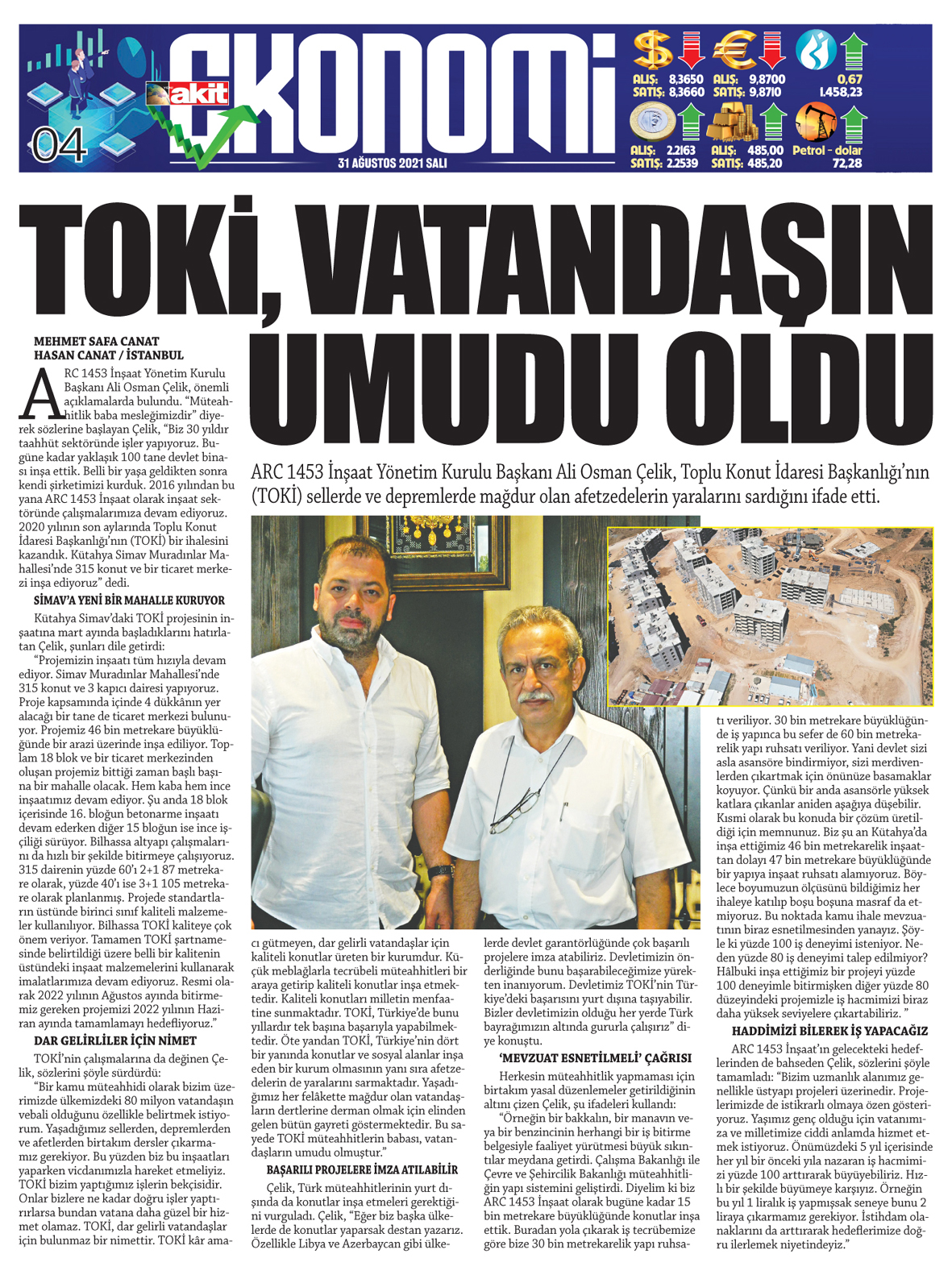 TOKİ, vatandaşın umudu oldu Yeni Akit Gazetesi / 31.08.2021 ARC 1453 İnşaat Yönetim Kurulu Başkanı Ali Osman Çelik, Toplu Konut İdaresi Başkanlığı'nın (TOKİ) sellerde ve depremlerde mağdur olan afetzedelerin yaralarını sardığını ifade etti. ARC 1453 İnşaat Yönetim Kurulu Başkanı Ali Osman Çelik, önemli açıklamalarda bulundu. "Müteahhitlik baba mesleğimizdir" diyerek sözlerine başlayan Çelik, "Biz 30 yıldır taahhüt sektöründe işler yapıyoruz. Bugüne kadar yaklaşık 100 tane devlet binası inşa ettik. Belli bir yaşa geldikten sonra kendi şirketimizi kurduk. 2016 yılından bu yana ARC 1453 İnşaat olarak inşaat sektöründe çalışmalarımıza devam ediyoruz. 2020 yılının son aylarında Toplu Konut İdaresi Başkanlığı'nın (TOKİ) bir ihalesini kazandık. Kütahya Simav Muradınlar Mahallesi'nde 315 konut ve bir ticaret merkezi inşa ediyoruz" dedi. Simav'a yeni bir mahalle kuruyor Kütahya Simav'daki TOKİ projesinin inşaatına mart ayında başladıklarını hatırlatan Çelik, şunları dile getirdi: "Projemizin inşaatı tüm hızıyla devam ediyor. Simav Muradınlar Mahallesi'nde 315 konut ve 3 kapıcı dairesi yapıyoruz. Proje kapsamında içinde 4 dükkânın yer alacağı bir tane de ticaret merkezi bulunuyor. Projemiz 46 bin metrekare büyüklüğünde bir arazi üzerinde inşa ediliyor. Toplam 18 blok ve bir ticaret merkezinden oluşan projemiz bittiği zaman başlı başına bir mahalle olacak. Hem kaba hem ince inşaatımız devam ediyor. Şu anda 18 blok içerisinde 16. bloğun betonarme inşaatı devam ederken diğer 15 bloğun ise ince işçiliği sürüyor. Bilhassa altyapı çalışmalarını da hızlı bir şekilde bitirmeye çalışıyoruz. 315 dairenin yüzde 60'ı 2+1 87 metrekare olarak, yüzde 40'ı ise 3+1 105 metrekare olarak planlanmış. Projede standartların üstünde birinci sınıf kaliteli malzemeler kullanılıyor. Bilhassa TOKİ kaliteye çok önem veriyor. Tamamen TOKİ şartnamesinde belirtildiği üzere belli bir kalitenin üstündeki inşaat malzemelerini kullanarak imalatlarımıza devam ediyoruz. Resmi olarak 2022 yılının Ağustos ayında bitirmemiz gereken projemizi 2022 yılının Haziran ayında tamamlamayı hedefliyoruz." Dar gelirliler için nimet TOKİ'nin çalışmalarına da değinen Çelik, sözlerini şöyle sürdürdü: "Bir kamu müteahhidi olarak bizim üzerimizde ülkemizdeki 80 milyon vatandaşın vebali olduğunu özellikle belirtmek istiyorum. Yaşadığımız sellerden, depremlerden ve afetlerden birtakım dersler çıkarmamız gerekiyor. Bu yüzden biz bu inşaatları yaparken vicdanımızla hareket etmeliyiz. TOKİ bizim yaptığımız işlerin bekçisidir. Onlar bizlere ne kadar doğru işler yaptırırlarsa bundan vatana daha güzel bir hizmet olamaz. TOKİ, dar gelirli vatandaşlar için bulunmaz bir nimettir. TOKİ kâr amacı gütmeyen, dar gelirli vatandaşlar için kaliteli konutlar üreten bir kurumdur. Küçük meblağlarla tecrübeli müteahhitleri bir araya getirip kaliteli konutlar inşa etmektedir. Kaliteli konutları milletin menfaatine sunmaktadır. TOKİ, Türkiye'de bunu yıllardır tek başına başarıyla yapabilmektedir. Öte yandan TOKİ, Türkiye'nin dört bir yanında konutlar ve sosyal alanlar inşa eden bir kurum olmasının yanı sıra afetzedelerin de yaralarını sarmaktadır. Yaşadığımız her felâkette mağdur olan vatandaşların dertlerine derman olmak için elinden gelen bütün gayreti göstermektedir. Bu sayede TOKİ müteahhitlerin babası, vatandaşların umudu olmuştur." Başarılı projelere imza atılabilir Çelik, Türk müteahhitlerinin yurt dışında da konutlar inşa etmeleri gerektiğini vurguladı. Çelik, "Eğer biz başka ülkelerde de konutlar yaparsak destan yazarız. Özellikle Libya ve Azerbaycan gibi ülkelerde devlet garantörlüğünde çok başarılı projelere imza atabiliriz. Devletimizin önderliğinde bunu başarabileceğimize yürekten inanıyorum. Devletimiz TOKİ'nin Türkiye'deki başarısını yurt dışına taşıyabilir. Bizler devletimizin olduğu her yerde Türk bayrağımızın altında gururla çalışırız" diye konuştu. 'Mevzuat esnetilmeli' çağrısı Herkesin müteahhitlik yapmaması için birtakım yasal düzenlemeler getirildiğinin altını çizen Çelik, şu ifadeleri kullandı: "Örneğin bir bakkalın, bir manavın veya bir benzincinin herhangi bir iş bitirme belgesiyle faaliyet yürütmesi büyük sıkıntılar meydana getirdi. Çalışma Bakanlığı ile Çevre ve Şehircilik Bakanlığı müteahhitliğin yapı sistemini geliştirdi. Diyelim ki biz ARC 1453 İnşaat olarak bugüne kadar 15 bin metrekare büyüklüğünde konutlar inşa ettik. Buradan yola çıkarak iş tecrübemize göre bize 30 bin metrekarelik yapı ruhsatı veriliyor. 30 bin metrekare büyüklüğünde iş yapınca bu sefer de 60 bin metrekarelik yapı ruhsatı veriliyor. Yani devlet sizi asla asansöre bindirmiyor, sizi merdivenlerden çıkartmak için önünüze basamaklar koyuyor. Çünkü bir anda asansörle yüksek katlara çıkanlar aniden aşağıya düşebilir. Kısmi olarak bu konuda bir çözüm üretildiği için memnunuz. Biz şu an Kütahya'da inşa ettiğimiz 46 bin metrekarelik inşaattan dolayı 47 bin metrekare büyüklüğünde bir yapıya inşaat ruhsatı alamıyoruz. Böylece boyumuzun ölçüsünü bildiğimiz her ihaleye katılıp boşu boşuna masraf da etmiyoruz. Bu noktada kamu ihale mevzuatının biraz esnetilmesinden yanayız. Şöyle ki yüzde 100 iş deneyimi isteniyor. Neden yüzde 80 iş deneyimi talep edilmiyor? Hâlbuki inşa ettiğimiz bir projeyi yüzde 100 deneyimle bitirmişken diğer yüzde 80 düzeyindeki projemizle iş hacmimizi biraz daha yüksek seviyelere çıkartabiliriz. " Haddimizi bilerek iş yapacağız ARC 1453 İnşaat'ın gelecekteki hedeflerinden de bahseden Çelik, sözlerini şöyle tamamladı: "Bizim uzmanlık alanımız genellikle üstyapı projeleri 