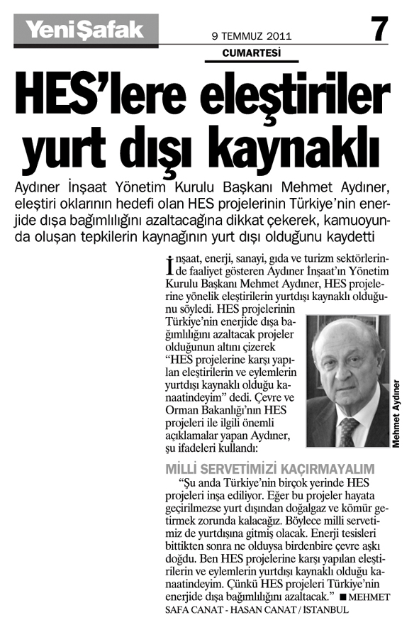 İnşaat, enerji, sanayi, gıda ve turizm sektörlerinde faaliyet gösteren Aydıner İnşaat'ın Yönetim Kurulu Başkanı Mehmet Aydıner, HES projelerine yönelik eleştirilerin yurtdışı kaynaklı olduğunu söyledi. HES projelerinin Türkiye'nin enerjide dışa bağımlılığını azaltacak projeler olduğunun altını çizerek 'HES projelerine karşı yapılan eleştirilerin ve eylemlerin yurtdışı kaynaklı olduğu kanaatindeyim' dedi. Çevre ve Orman Bakanlığı'nın HES projeleri ile ilgili önemli açıklamalar yapan Aydıner, şu ifadeleri kullandı: