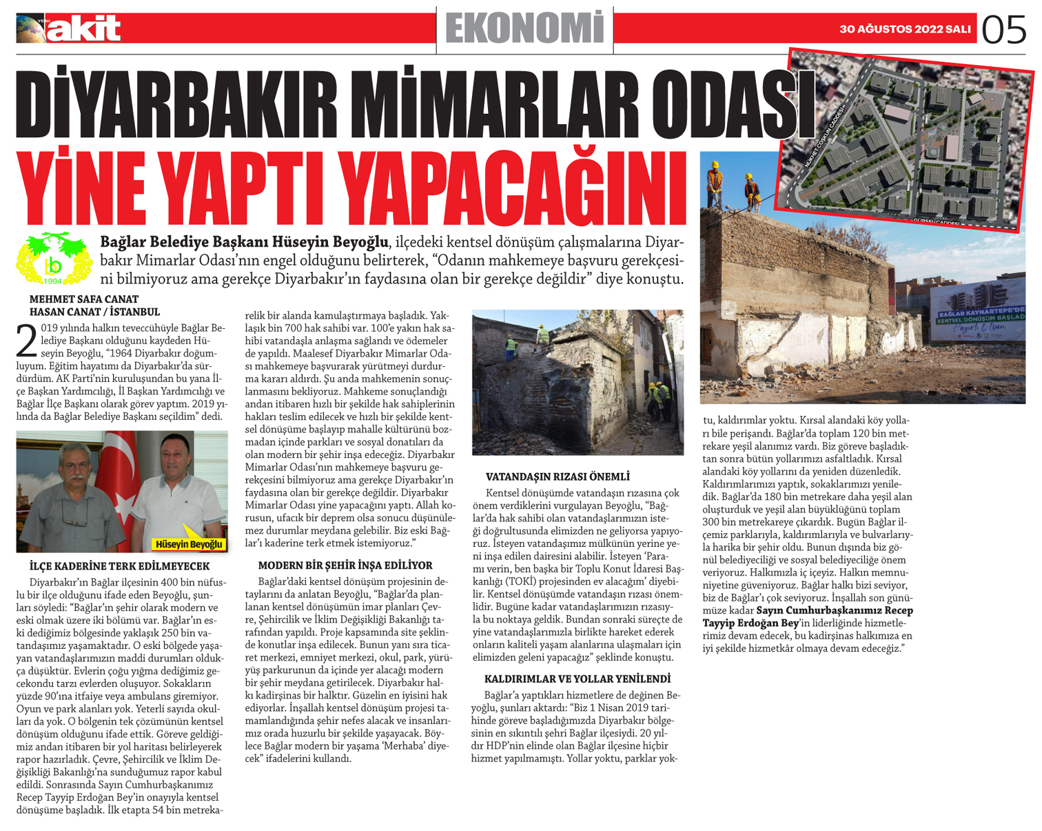 Diyarbakır'ın Bağlar ilçesinin 400 bin nüfuslu bir ilçe olduğunu ifade eden Beyoğlu, şunları söyledi: "Bağlar'ın şehir olarak modern ve eski olmak üzere iki bölümü var. Bağlar'ın eski dediğimiz bölgesinde yaklaşık 250 bin vatandaşımız yaşamaktadır. O eski bölgede yaşayan vatandaşlarımızın maddi durumları oldukça düşüktür. Evlerin çoğu yığma dediğimiz gecekondu tarzı evlerden oluşuyor. Sokakların yüzde 90'ına itfaiye veya ambulans giremiyor. Oyun ve park alanları yok. Yeterli sayıda okulları da yok. O bölgenin tek çözümünün kentsel dönüşüm olduğunu ifade ettik. Göreve geldiğimiz andan itibaren bir yol haritası belirleyerek rapor hazırladık. Çevre, Şehircilik ve İklim Değişikliği Bakanlığı'na sunduğumuz rapor kabul edildi. Sonrasında Sayın Cumhurbaşkanımız Recep Tayyip Erdoğan Bey'in onayıyla kentsel dönüşüme başladık. İlk etapta 54 bin metrekarelik bir alanda kamulaştırmaya başladık. Yaklaşık bin 700 hak sahibi var. 100'e yakın hak sahibi vatandaşla anlaşma sağlandı ve ödemeler de yapıldı. Maalesef Diyarbakır Mimarlar Odası mahkemeye başvurarak yürütmeyi durdurma kararı aldırdı. Şu anda mahkemenin sonuçlanmasını bekliyoruz. Mahkeme sonuçlandığı andan itibaren hızlı bir şekilde hak sahiplerinin hakları teslim edilecek ve hızlı bir şekilde kentsel dönüşüme başlayıp mahalle kültürünü bozmadan içinde parkları ve sosyal donatıları da olan modern bir şehir inşa edeceğiz. Diyarbakır Mimarlar Odası'nın mahkemeye başvuru gerekçesini bilmiyoruz ama gerekçe Diyarbakır'ın faydasına olan bir gerekçe değildir. Diyarbakır Mimarlar Odası yine yapacağını yaptı. Allah korusun, ufacık bir deprem olsa sonucu düşünülemez durumlar meydana gelebilir. Biz eski Bağlar'ı kaderine terk etmek istemiyoruz."