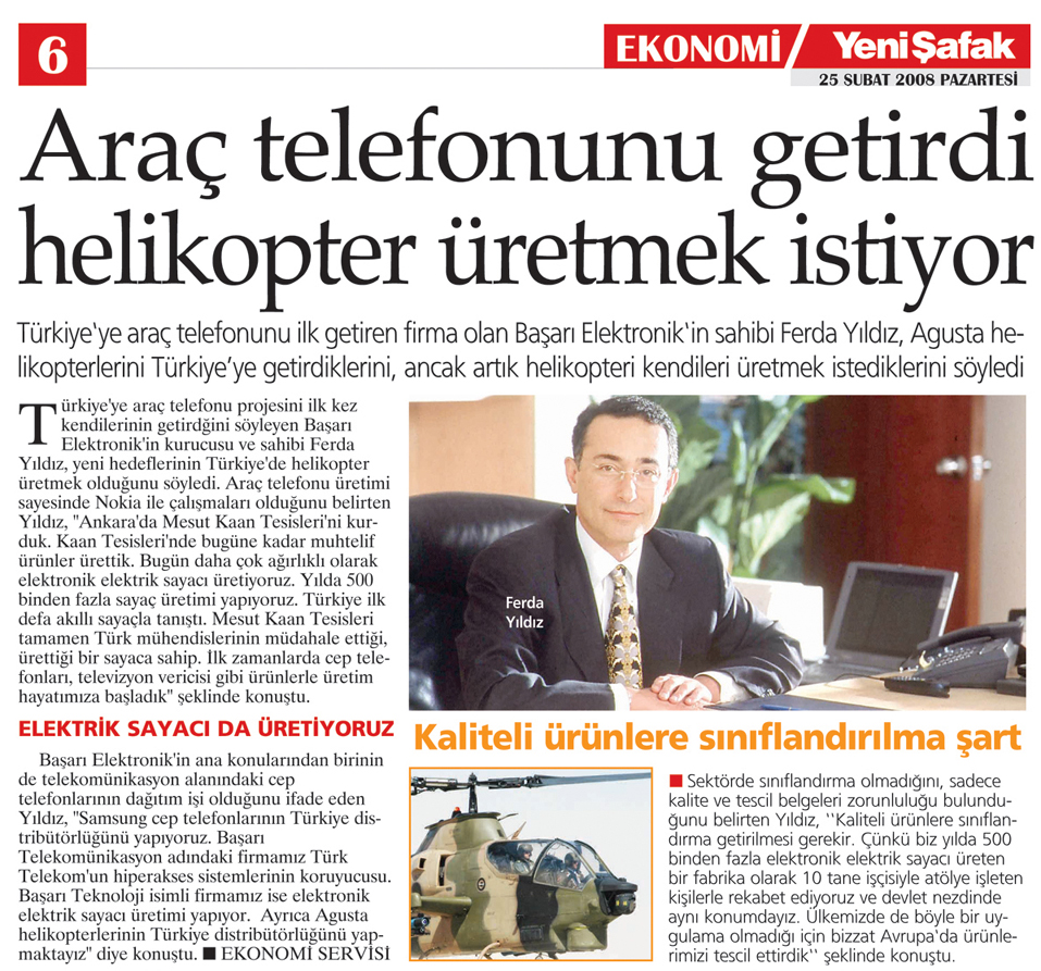 Türkiye'ye araç telefonu projesini ilk kez kendilerinin getirdiğini söyleyen Başarı Elektronik'in kurucusu ve sahibi Ferda Yıldız, yeni hedeflerinin Türkiye'de helikopter üretmek olduğunu söyledi. Araç telefonu üretimi sayesinde Nokia ile çalışmaları olduğunu belirten Yıldız, 'Ankara'da Mesut Kaan Tesisleri'ni kurduk. Kaan Tesisleri'nde bugüne kadar muhtelif ürünler ürettik. Bugün daha çok ağırlıklı olarak elektronik elektrik sayacı üretiyoruz. Yılda 500 binden fazla sayaç üretimi yapıyoruz. Türkiye ilk defa akıllı sayaçla tanıştı. Mesut Kaan Tesisleri tamamen Türk mühendislerinin müdahale ettiği, ürettiği bir sayaca sahip. İlk zamanlarda cep telefonları, televizyon vericisi gibi ürünlerle üretim hayatımıza başladık' şeklinde konuştu.