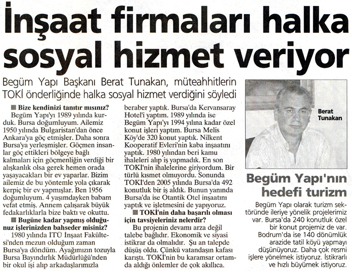 Begüm Yapı olarak turizm sektöründe ileriye yönelik projelerimiz var. Bursa'da 240 konutluk özel bir konut projemiz de var. Bodrum'da ise 140 dönümlük arazide tatil köyü yapmayı düşünüyoruz. Daha çok resmi işlere yönelmek istiyoruz. İstikrarlı ve hızlı büyümek istiyoruz.
