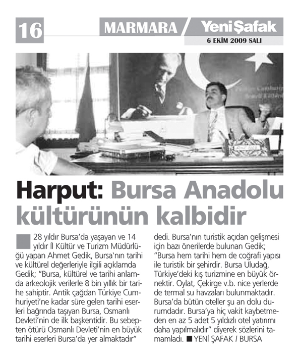 Bursa İl Kültür ve Turizm Müdürü Ahmet Gedik, Anadolu'nun dünyanın açık hava müzesi olduğunu söyledi. Gedik, Bursa'nın da Anadolu kültürünün kalbi olduğunu ifade etti.
