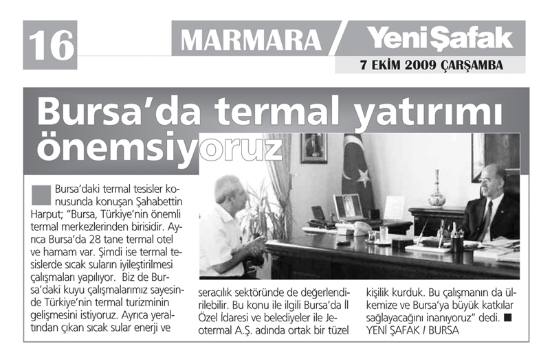 Harput, 'Bursa, Türkiye'nin en önemli termal merkezlerinden birisidir. Ayrıca Bursa'da 28 tane termal otel ve hamam var. Şimdi ise termal tesislerde sıcak suların iyileştirilmesi çalışmaları yapılıyor. Biz de Bursa'daki kuyu çalışmalarımız sayesinde Türkiye'nin termal turizminin gelişmesini istiyoruz. Ayrıca yeraltından çıkan sıcak sular enerji ve seracılık sektöründe de değerlendirilebilir. Bu konu ile iligili Bursa'da İl Özel İdaresi ve belediyeler ile Jeotermal A.Ş. adından ortak bir tüzel kişilik kurduk. Bu çalışmanın da ülkemize ve Bursa'ya büyük katkılar sağlayacağına inanıyoruz' dedi.