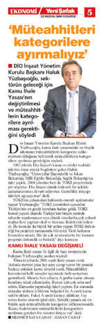 Dio İnşaat Yönetim Kurulu Başkanı Haluk Yüzbaşıoğlu, kamu ihale yasasındaki en büyük sıkıntının müteahhitlerin kategorize edilememesi olduğunu belirterek müteahhitlerin kategorilere ayrılması gerektiğini söyledi. 1982 yılında Dio İnşaat'ı kuran ve devlet taahhüt işlerine imza atarak bugünlere gelen Haluk Yüzbaşıoğlu; 'Uzun yıllar Bayındırlık ve İskan Bakanlığı, Milli Eğitim Bakanlığı, Sağlık Bakanlığı'na işler yaptık. 2004 yılından beri de TOKİ projelerinde yer alıyoruz. Dio İnşaat olarak istikrarlı bir şekilde çalışmalarımıza devam ediyoruz. Genellikle üstyapı işleriyle uğraşıyoruz' dedi. TOKİ'nin çalışmaları hakkında önemli açıklamalar yapan Yüzbaşıoğlu; 'TOKİ yatırımları açısından Türkiye'nin en güçlü kuruluşu haline geldi. TOKİ konut yapımı dışında Türkiye'nin birçok yerinde yıllardır yapılamayan veya düşük standartta çok yüksek maliyetlere yapılan okul ve hastane ihalelerini üstlendi. Bu konuda da büyük bir atılım yapan TOKİ üstlendiği bu projeleri zamanında bitirerek Türk halkının hizmetine sundu. Biz de çok iyi standartta bir hastane projesini üstlendik ve bitirdik' diye konuştu.