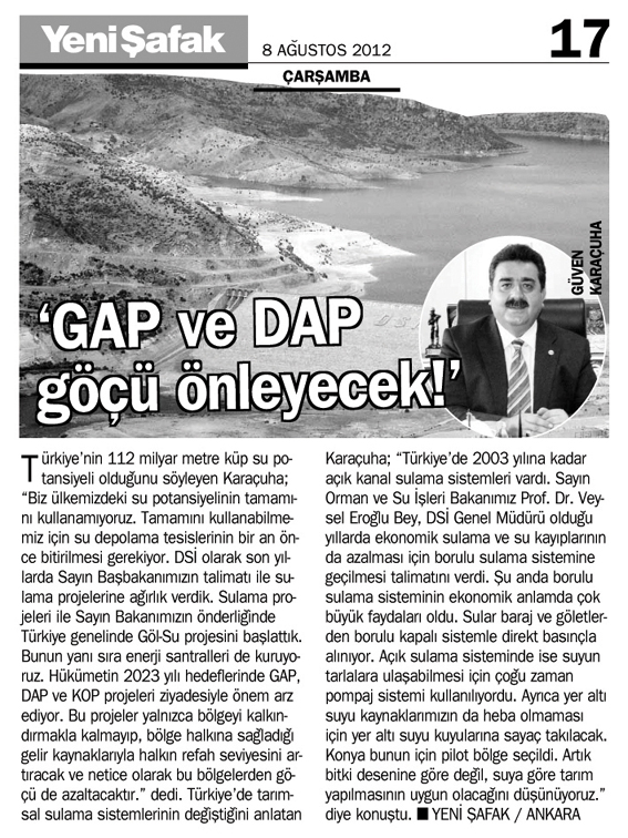 DSİ Genel Müdür Yardımcısı Güven Karaçuha, hükümetin 2023 yılı hedefleri doğrultusunda GAP ve DAP projelerinin büyük önem arz ettiğini belirtti. Karaçuha,'Bu projeler bölgeyi kalkındıracağı gibi bölgeden göçü de azaltacak' dedi.