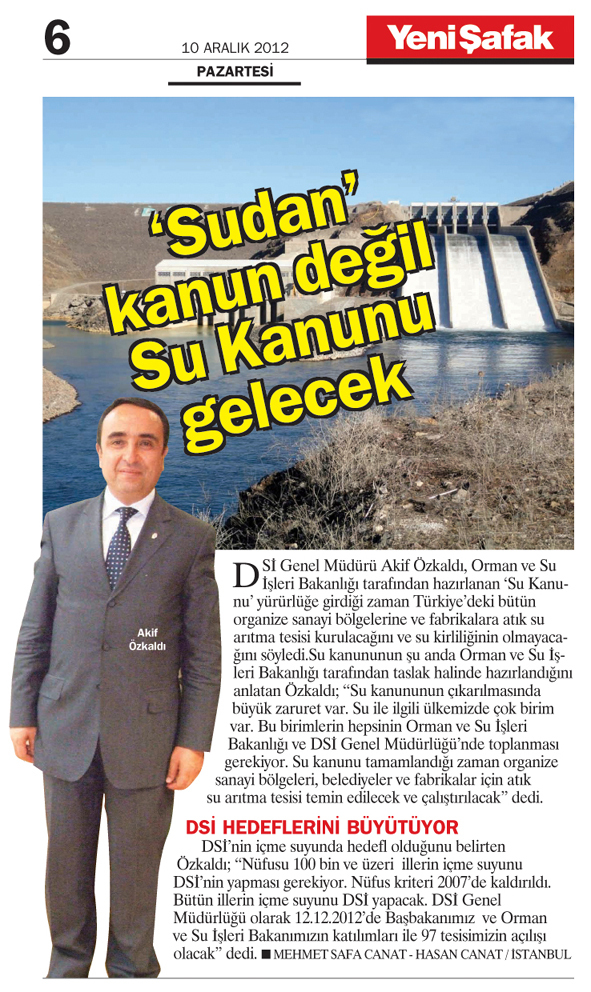 DSİ Genel Müdürü Akif Özkaldı, Orman ve Su İşleri Bakanlığı tarafından hazırlanan 'Su Kanunu' yürürlüğe girdiği zaman Türkiye'deki bütün organize sanayi bölgelerine ve fabrikalara atık su arıtma tesisi kurulacağını ve su kirliliğinin olmayacağını söyledi.