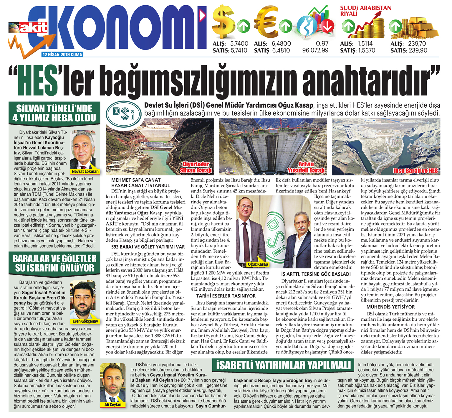 "HES'ler bağımsızlığımızın anahtarıdır" Yeni Akit Gazetesi / 12.04.2019 Devlet Su İşleri (DSİ) Genel Müdür Yardımcısı Oğuz Kasap, inşa ettikleri HES'ler sayesinde enerjide dışa bağımlılığın azalacağını ve bu tesislerin ülke ekonomisine milyarlarca dolar katkı sağlayacağını söyledi. DSİ'nin inşa ettiği en büyük projelerin barajlar, göletler, sulama tesisleri, enerji tesisleri ve taşkın koruma tesisleri olduğunu dile getiren DSİ Genel Müdür Yardımcısı Oğuz Kasap, yaptıkları çalışmalar ve hedefleriyle ilgili Yeni Akit'e konuştu. DSİ'nin amacının ülkemizin su kaynaklarını korumak, geliştirmek ve yönetmek olduğunu kaydeden Kasap, şu bilgileri paylaştı: 593 baraj ve gölet yatırımı var DSİ, kurulduğu günden bu yana birçok baraj inşa etmiştir. Şu ana kadar inşa edilen ve hizmete alınan baraj ve göletlerin sayısı 2000'lere ulaşmıştır. Hâlâ 83 baraj ve 510 gölet olmak üzere 593 adet baraj ve gölet yatırım programında olup inşa halindedir. Bunların içerisinde en önemli olan projelerden biri Artvin'deki Yusufeli Barajı'dır. Yusufeli Barajı, Çoruh Nehri üzerinde yer almaktadır. Baraj çift eğrilikli beton kemer tipindedir ve yüksekliği 275 metredir. Bu yükseklikle kendi sınıfında dünyanın en yüksek 3. barajıdır. Kurulu enerji gücü 558 MW'dır ve yıllık enerji üretim kapasitesi ise 1.888 GWH'dır. Tamamlandığı zaman üreteceği elektrik enerjisi ile ekonomiye yılda 220 milyon dolar katkı sağlayacaktır. Bir diğer önemli projemiz ise Ilısu Barajı'dır. Ilısu Barajı, Mardin ve Şırnak il sınırları arasında Suriye sınırına 45 km mesafedeki Dicle Nehri üzerinde yer almaktadır. Önyüzü beton kaplı kaya dolgu tipinde inşa edilen baraj, dolgu hacmi bakımından ülkemizin 2. büyük, enerji üretimi açısından ise 4. büyük barajı konumundadır. Temelden 135 metre yüksekliği olan Ilısu Barajı'nın kurulu enerji gücü 1.200 MW ve yıllık enerji üretim kapasitesi ise 4,12 milyar KWH'dır. Tamamlandığı zaman ekonomiye yılda 412 milyon dolar katkı sağlayacaktır. Tarihi eserler taşınıyor Ilısu Barajı'nın inşaatını tamamladık. Şu an barajın rezervuar alanı içerisinde yer alan kültür varlıklarının taşınma işlemlerini yapıyoruz. Bu kapsamda başlıca; Zeynel Bey Türbesi, Artuklu Hamamı, İmam Abdullah Zaviyesi, Orta kapı, Kızlar (Eyyübi) Cami, Koç Cami, Süleyman Han Cami, Er Rızk Cami ve Baldiken Türbeleri gibi kültür mirası eserler yer almakta olup, bu eserler ülkemizde ilk defa kullanılan modüler taşıyıcı sistemler vasıtasıyla baraj rezervuar kotu üzerinde inşa edilen Yeni Hasankeyf İlçesine taşınmaktadır. Diğer yandan su altında kalacak olan Hasankeyf ilçesinde yer alan konut ve resmi daireler de yeni yerleşim alanında inşa edilmekte olup bu konutlar hak sahiplerine teslim edilmekte ve resmi dairelere taşınma işlemleri de devam etmektedir. İş arttı, tersine göç başladı Diyarbakır il sınırları içerisinde inşa edilmekte olan Silvan Barajı'ndan alınacak 212 m3/s su ile 2 milyon 351 bin dekar alan sulanacak ve 681 GWH/yıl enerji üretilecektir. Güneydoğu'ya hayat verecek olan Silvan Projesi tamamlandığında yılda 1,100 milyar lira ülke ekonomisine katkı sağlayacaktır. Önceki yıllarda yöre insanının iş umuduyla Doğu'dan Batı'ya doğru yapmış olduğu göçler, bu projelerle Doğu ve Güneydoğu'da artan tarım ve iş potansiyeli sayesinde Batı'dan Doğu'ya doğru göçlere dönüşmeye başlamıştır. Çünkü önceki yıllarda insanlar tarıma elverişli olup da sulayamadığı tarım arazilerini bırakıp büyük şehirlere göç ediyordu. Şimdi tekrar köylerine dönüp tarlalarını ekecekler. Bu sayede hem kendileri kazanacak hem de ülke ekonomisine katkı sağlayacaklardır. Genel Müdürlüğümüz bir taraftan da içme suyu temin projelerine ağırlık vermektedir. Bu alanda yürütmekte olduğumuz projelerden en önemlisi İstanbul ilinin 2071 yılına kadar içme, kullanma ve endüstri suyunun karşılanması ve hidroelektrik enerji üretimi yapılması için geliştirilmiş bir projenin en önemli ayağını teşkil eden Melen Barajı'dır. Temelden 124 metre yükseklikte ve SSB (silindirle sıkıştırılmış beton) tipinde olup bu projede de çalışmalarımız devam etmektedir. Melen sisteminin hayata geçirilmesi ile İstanbul'a yılda 1 milyar 77 milyon m3 ilave içme suyu temin edilmiş olacaktır. Bu projeler ülkemizin prestij projeleridir. Mühendis yetişiyor DSİ olarak Türk mühendis ve mimarları ile inşa ettiğimiz bu projelerle mühendislik anlamında da hem yüklenici firmalar hem de DSİ'nin bünyesindeki mühendisler büyük tecrübeler kazanmıştır. Dolayısıyla projelerimiz sayesinde konularında uzman mühendisler yetişmektedir. Silvan Tüneli'nde 4 yılımız heba oldu Diyarbakır'daki Silvan Tüneli'ni inşa eden Kayaoğlu İnşaat'ın Genel Koordinatörü Nevzat Lokman Beştav, Silvan Tüneli'ndeki çalışmalarla ilgili çarpıcı tespitlerde bulundu. DSİ'nin önem verdiği projelerin başında Silvan Tüneli inşaatının geldiğine dikkat çeken Beştav, "Bu iletim tünellerinin yapım ihalesi 2011 yılında yapılmış olup, kazıya 2014 yılında Almanya'dan satın alınan TDM (Tünel Delme Makinası) ile başlanmıştır. Kazı devam ederken 21 Nisan 2015 tarihinde 4 bin 668 metreye gelindiğinde, zeminden gelen metan gazı parlaması nedeniyle patlama yaşanmış ve TDM yanarak tünel içinde kalmış, sonrasında tünel kazısı iptal edilmiştir. Sonra, yeni bir güzergahtan 10 metre iç çapında tek bir tünelle Silvan Barajı istikametine gidecek şekilde proje hazırlanmış ve ihale yapılmıştır. Halen yapılan ihalenin sonucu beklenmektedir" dedi. Barajlar ve göletler su israfını önlüyor Barajların ve göletlerin su israfını önlediğini söyleyen Sager İnşaat Yönetim Kurulu Başkan