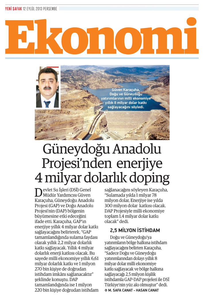 Karaçuha, GAP'ın enerjiye yıllık 4 milyar dolar katkı sağlayacağını belirterek, 'GAP tamamlandığında sulama faydası olarak yıllık 2,2 milyar dolarlık katkı sağlayacak. Yıllık 4 milyar dolarlık enerji katkısı olacak. Bu sayede milli ekonomiye yıllık 6,61 milyar dolarlık katkı ve 1 milyon 270 bin kişiye de doğrudan istihdam imkânı sağlanacaktır' şeklinde konuştu. DAP tamamlandığında ise 1 milyon 220 bin kişiye doğrudan istihdam sağlanacağını söyleyen Karaçuha, 'Sulamada yılda 1 milyar 78 milyon dolar, Enerjiye ise yılda 300 milyon dolar katkısı olacak. DAP Projesiyle milli ekonomiye toplam 1,4 milyar dolar katkı olacak' dedi.