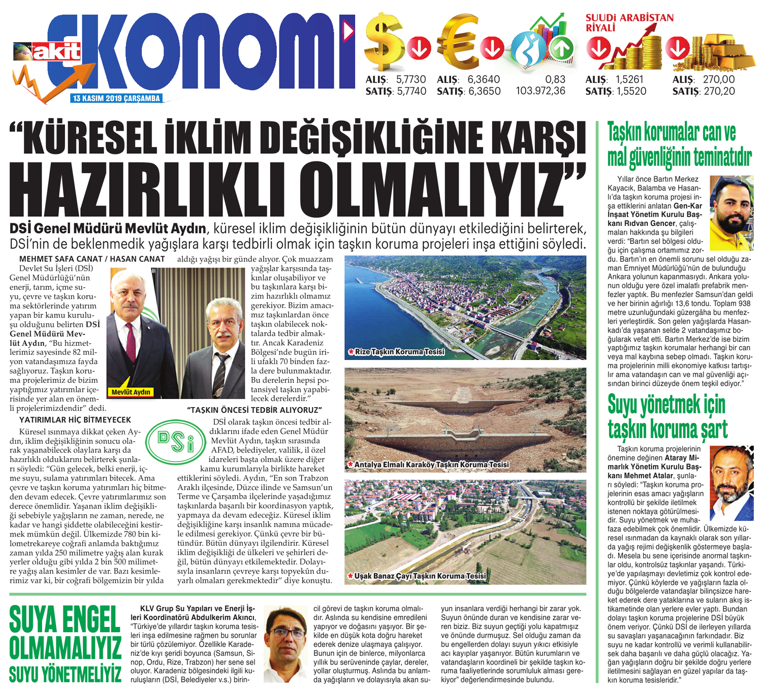 "Küresel iklim değişikliğine karşı hazırlıklı olmalıyız" Yeni Akit Gazetesi / 13.11.2019 DSİ Genel Müdürü Mevlüt Aydın, küresel iklim değişikliğinin bütün dünyayı etkilediğini belirterek, DSİ'nin de beklenmedik yağışlara karşı tedbirli olmak için taşkın koruma projeleri inşa ettiğini söyledi. Devlet Su İşleri (DSİ) Genel Müdürlüğü'nün enerji, tarım, içme suyu, çevre ve taşkın koruma sektörlerinde yatırım yapan bir kamu kuruluşu olduğunu belirten DSİ Genel Müdürü Mevlüt Aydın, "Bu hizmetlerimiz sayesinde 82 milyon vatandaşımıza fayda sağlıyoruz. Taşkın koruma projelerimiz de bizim yaptığımız yatırımlar içerisinde yer alan en önemli projelerimizdendir" dedi. Yatırımlar hiç bitmeyecek Küresel ısınmaya dikkat çeken Aydın, iklim değişikliğinin sonucu olarak yaşanabilecek olaylara karşı da hazırlıklı olduklarını belirterek şunları söyledi: "Gün gelecek, belki enerji, içme suyu, sulama yatırımları bitecek. Ama çevre ve taşkın koruma yatırımları hiç bitmeden devam edecek. Çevre yatırımlarımız son derece önemlidir. Yaşanan iklim değişikliği sebebiyle yağışların ne zaman, nerede, ne kadar ve hangi şiddette olabileceğini kestirmek mümkün değil. Ülkemizde 780 bin kilometrekareye coğrafi anlamda baktığımız zaman yılda 250 milimetre yağış alan kurak yerler olduğu gibi yılda 2 bin 500 milimetre yağış alan kesimler de var. Bazı kesimlerimiz var ki, bir coğrafi bölgemizin bir yılda aldığı yağışı bir günde alıyor. Çok muazzam yağışlar karşısında taşkınlar oluşabiliyor ve bu taşkınlara karşı bizim hazırlıklı olmamız gerekiyor. Bizim amacımız taşkınlardan önce taşkın olabilecek noktalarda tedbir almaktır. Ancak Karadeniz Bölgesi'nde bugün irili ufaklı 70 binden fazla dere bulunmaktadır. Bu derelerin hepsi potansiyel taşkın yapabilecek derelerdir." "Taşkın öncesi tedbir alıyoruz" DSİ olarak taşkın öncesi tedbir aldıklarını ifade eden Genel Müdür Mevlüt Aydın, taşkın sırasında AFAD, belediyeler, valilik, il özel idareleri başta olmak üzere diğer kamu kurumlarıyla birlikte hareket ettiklerini söyledi. Aydın, "En son Trabzon Araklı ilçesinde, Düzce ilinde ve Samsun'un Terme ve Çarşamba ilçelerinde yaşadığımız taşkınlarda başarılı bir koordinasyon yaptık, yapmaya da devam edeceğiz. Küresel iklim değişikliğine karşı insanlık namına mücadele edilmesi gerekiyor. Çünkü çevre bir bütündür. Bütün dünyayı ilgilendirir. Küresel iklim değişikliği de ülkeleri ve şehirleri değil, bütün dünyayı etkilemektedir. Dolayısıyla insanların çevreye karşı topyekûn duyarlı olmaları gerekmektedir" diye konuştu. Suya engel olmamalıyız suyu yönetmeliyiz KLV Grup Su Yapıları ve Enerji İşleri Koordinatörü Abdulkerim Akıncı, "Türkiye'de yıllardır taşkın koruma tesisleri inşa edilmesine rağmen bu sorunlar bir türlü çözülemiyor. Özellikle Karadeniz'de kıyı şeridi boyunca (Samsun, Sinop, Ordu, Rize, Trabzon) her sene sel oluyor. Karadeniz bölgesindeki ilgili kuruluşların (DSİ, Belediyeler v.s.) birincil görevi de taşkın koruma olmalıdır. Aslında su kendisine emredileni yapıyor ve doğasını yaşıyor. Bir şekilde en düşük kota doğru hareket ederek denize ulaşmaya çalışıyor. Bunun için de binlerce, milyonlarca yıllık bu serüveninde çaylar, dereler, yollar oluşturmuş. Aslında bu anlamda yağışların ve dolayısıyla akan suyun insanlara verdiği herhangi bir zarar yok. Suyun önünde duran ve kendisine zarar veren biziz. Biz suyun geçtiği yolu kapatmışız ve önünde durmuşuz. Sel olduğu zaman da bu engellerden dolayı suyun yıkıcı etkisiyle acı kayıplar yaşanıyor. Bütün kurumların ve vatandaşların koordineli bir şekilde taşkın koruma faaliyetlerinde sorumluluk alması gerekiyor" değerlendirmesinde bulundu. Taşkın korumalar can ve mal güvenliğinin teminatıdır Yıllar önce Bartın Merkez Kayacık, Balamba ve Hasanlı'da taşkın koruma projesi inşa ettiklerini anlatan Gen-Kar İnşaat Yönetim Kurulu Başkanı Rıdvan Gencer, çalışmaları hakkında şu bilgileri verdi: "Bartın sel bölgesi olduğu için çalışma ortamımız zordu. Bartın'ın en önemli sorunu sel olduğu zaman Emniyet Müdürlüğü'nün de bulunduğu Ankara yolunun kapanmasıydı. Ankara yolunun olduğu yere özel imalatlı prefabrik menfezler yaptık. Bu menfezler Samsun'dan geldi ve her birinin ağırlığı 13,6 tondu. Toplam 938 metre uzunluğundaki güzergâha bu menfezleri yerleştirdik. Son gelen yağışlarda Hasankadı'da yaşanan selde 2 vatandaşımız boğularak vefat etti. Bartın Merkez'de ise bizim yaptığımız taşkın korumalar herhangi bir can veya mal kaybına sebep olmadı. Taşkın koruma projelerinin milli ekonomiye katkısı tartışılır ama vatandaşın can ve mal güvenliği açısından birinci düzeyde önem teşkil ediyor." Suyu yönetmek için taşkın koruma şart Taşkın koruma projelerinin önemine değinen Ataray Mimarlık Yönetim Kurulu Başkanı Mehmet Atalar, şunları söyledi: "Taşkın koruma projelerinin esas amacı yağışların kontrollü bir şekilde iletilmek istenen noktaya götürülmesidir. Suyu yönetmek ve muhafaza edebilmek çok önemlidir. Ülkemizde küresel ısınmadan da kaynaklı olarak son yıllarda yağış rejimi değişkenlik göstermeye başladı. Mesela bu sene içerisinde anormal taşkınlar oldu, kontrolsüz taşkınlar yaşandı. Türkiye'de yapılaşmayı devletimiz çok kontrol edemiyor. Çünkü köylerde ve yağışların fazla olduğu bölgelerde vatandaşlar bilinçsizce hareket ederek dere yataklarına ve suların akış istikametinde olan yerlere evler yaptı. Bundan dolayı taşkın koruma projelerine DSİ büyük önem veriyor. Çünkü DSİ de ilerleyen yıllarda su savaşları yaşanacağının farkındadır. Biz suyu ne kadar kont