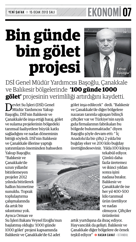Devlet Su İşleri (DSİ) Genel Müdür Yardımcısı Yakup Başoğlu, DSİ'nin Balıkesir ve Çanakkale'de inşa ettiği baraj, gölet ve sulama projelerinin bölgedeki tarımsal faaliyetlere büyük katkı sağladığını ve nadas döneminin bittiği söyledi. DSİ'nin Balıkesir ve Çanakkale illerine yaptığı yatırımların öneminden bahseden Yakup Başoğlu; 'Balıkesir ve Çanakkale'de uzun yıllardır bitirilemeyen projeler 2012 yılında bitirilerek halkın hizmetine sunuldu. Toprak toplulaştırma çalışmalarında da artık bir sıkıntımız yok. Ayrıca Orman ve Su İşleri Bakanı Veysel Eroğlu'nun başlatmış olduğu '1000 günde 1000 gölet' projesi kapsamında Balıkesir ve Çanakkale'de 62 adet gölet inşa edilecek' dedi. 'Balıkesir ve Çanakkale'de diğer bölgelere nazaran tarımla uğraşan bilinçli çiftçiler var ve Türkiye'nin sayılı gıda firmalarının fabrikaları bu bölgede bulunmaktadır.' diyen Başoğlu şöyle devam etti: ' İç Anadolu'da bir çiftçi 2 yılda bir buğday eker ve 200 kilo buğday ürettiğindesevinir. Yılda 100 kiloya tekabül ediyor. Çünkü daha fazla üretemez ve ikinci yıldan sonra işini nadasa bırakır. Balıkesir ve Çanakkale'de ise her yıl 400-500 kilo tarımsal ürün üretiliyor ve nadas olmuyor. Çiftçiler ürünlerini artık yurtdışına da ihraç ediyor. Hayvancılık da gelişti. Balıkesir ve Çanakkale diğer bölgelere de örnek teşkil ediyor'