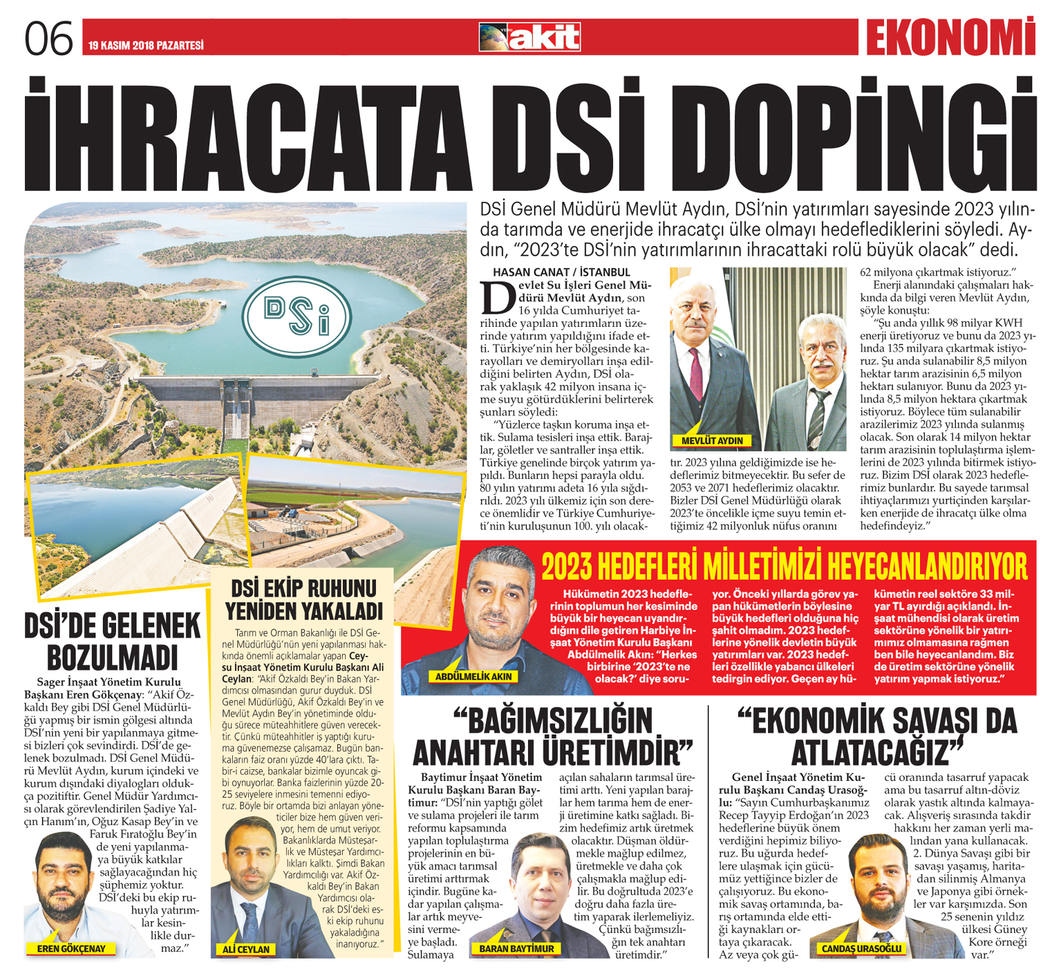 İhracata DSİ dopingi Yeni Akit Gazetesi / 19.11.2018 DSİ Genel Müdürü Mevlüt Aydın, DSİ'nin yatırımları sayesinde 2023 yılında tarımda ve enerjide ihracatçı ülke olmayı hedeflediklerini söyledi. Aydın, "2023'te DSİ'nin yatırımlarının ihracattaki rolü büyük olacak" dedi. Devlet Su İşleri Genel Müdürü Mevlüt Aydın, son 16 yılda Cumhuriyet tarihinde yapılan yatırımların üzerinde yatırım yapıldığını ifade etti. Türkiye'nin her bölgesinde karayolları ve demiryolları inşa edildiğini belirten Aydın, DSİ olarak yaklaşık 42 milyon insana içme suyu götürdüklerini belirterek şunları söyledi: "Yüzlerce taşkın koruma inşa ettik. Sulama tesisleri inşa ettik. Barajlar, göletler ve santraller inşa ettik. Türkiye genelinde birçok yatırım yapıldı. Bunların hepsi parayla oldu. 80 yılın yatırımı adeta 16 yıla sığdırıldı. 2023 yılı ülkemiz için son derece önemlidir ve Türkiye Cumhuriyeti'nin kuruluşunun 100. yılı olacaktır. 2023 yılına geldiğimizde ise hedeflerimiz bitmeyecektir. Bu sefer de 2053 ve 2071 hedeflerimiz olacaktır. Bizler DSİ Genel Müdürlüğü olarak 2023'te öncelikle içme suyu temin ettiğimiz 42 milyonluk nüfus oranını 62 milyona çıkartmak istiyoruz." Enerji alanındaki çalışmaları hakkında da bilgi veren Mevlüt Aydın, şöyle konuştu: "Şu anda yıllık 98 milyar KWH enerji üretiyoruz ve bunu da 2023 yılında 135 milyara çıkartmak istiyoruz. Şu anda sulanabilir 8,5 milyon hektar tarım arazisinin 6,5 milyon hektarı sulanıyor. Bunu da 2023 yılında 8,5 milyon hektara çıkartmak istiyoruz. Böylece tüm sulanabilir arazilerimiz 2023 yılında sulanmış olacak. Son olarak 14 milyon hektar tarım arazisinin toplulaştırma işlemlerini de 2023 yılında bitirmek istiyoruz. Bizim DSİ olarak 2023 hedeflerimiz bunlardır. Bu sayede tarımsal ihtiyaçlarımızı yurtiçinden karşılarken enerjide de ihracatçı ülke olma hedefindeyiz." 2023 hedefleri milletimizi heyecanlandırıyor Hükümetin 2023 hedeflerinin toplumun her kesiminde büyük bir heyecan uyandırdığını dile getiren Harbiye İnşaat Yönetim Kurulu Başkanı Abdülmelik Akın: "Herkes birbirine '2023'te ne olacak?' diye soruyor. Önceki yıllarda görev yapan hükümetlerin böylesine büyük hedefleri olduğuna hiç şahit olmadım. 2023 hedeflerine yönelik devletin büyük yatırımları var. 2023 hedefleri özellikle yabancı ülkeleri tedirgin ediyor. Geçen ay hükümetin reel sektöre 33 milyar TL ayırdığı açıklandı. İnşaat mühendisi olarak üretim sektörüne yönelik bir yatırımımız olmamasına rağmen ben bile heyecanlandım. Biz de üretim sektörüne yönelik yatırım yapmak istiyoruz." DSİ'de gelenek bozulmadı Sager İnşaat Yönetim Kurulu Başkanı Eren Gökçenay: "Akif Özkaldı Bey gibi DSİ Genel Müdürlüğü yapmış bir ismin gölgesi altında DSİ'nin yeni bir yapılanmaya gitmesi bizleri çok sevindirdi. DSİ'de gelenek bozulmadı. DSİ Genel Müdürü Mevlüt Aydın, kurum içindeki ve kurum dışındaki diyalogları oldukça pozitiftir. Genel Müdür Yardımcısı olarak görevlendirilen Şadiye Yalçın Hanım'ın, Oğuz Kasap Bey'in ve Faruk Fıratoğlu Bey'in de yeni yapılanmaya büyük katkılar sağlayacağından hiç şüphemiz yoktur. DSİ'deki bu ekip ruhuyla yatırımlar kesinlikle durmaz." DSİ ekip ruhunu yeniden yakaladı Tarım ve Orman Bakanlığı ile DSİ Genel Müdürlüğü'nün yeni yapılanması hakkında önemli açıklamalar yapan Ceysu İnşaat Yönetim Kurulu Başkanı Ali Ceylan: "Akif Özkaldı Bey'in Bakan Yardımcısı olmasından gurur duyduk. DSİ Genel Müdürlüğü, Akif Özkaldı Bey'in ve Mevlüt Aydın Bey'in yönetiminde olduğu sürece müteahhitlere güven verecektir. Çünkü müteahhitler iş yaptığı kuruma güvenemezse çalışamaz. Bugün bankaların faiz oranı yüzde 40'lara çıktı. Tabir-i caizse, bankalar bizimle oyuncak gibi oynuyorlar. Banka faizlerinin yüzde 20-25 seviyelere inmesini temenni ediyoruz. Böyle bir ortamda bizi anlayan yöneticiler bize hem güven veriyor, hem de umut veriyor. Bakanlıklarda Müsteşarlık ve Müsteşar Yardımcılıkları kalktı. Şimdi Bakan Yardımcılığı var. Akif Özkaldı Bey'in Bakan Yardımcısı olarak DSİ'deki eski ekip ruhunu yakaladığına inanıyoruz." "Bağımsızlığın anahtarı üretimdir" Baytimur İnşaat Yönetim Kurulu Başkanı Baran Baytimur: "DSİ'nin yaptığı gölet ve sulama projeleri ile tarım reformu kapsamında yapılan toplulaştırma projelerinin en büyük amacı tarımsal üretimi arttırmak içindir. Bugüne kadar yapılan çalışmalar artık meyvesini vermeye başladı. Sulamaya açılan sahaların tarımsal üretimi arttı. Yeni yapılan barajlar hem tarıma hem de enerji üretimine katkı sağladı. Bizim hedefimiz artık üretmek olacaktır. Düşman öldürmekle mağlup edilmez, üretmekle ve daha çok çalışmakla mağlup edilir. Bu doğrultuda 2023'e doğru daha fazla üretim yaparak ilerlemeliyiz. Çünkü bağımsızlığın tek anahtarı üretimdir." "Ekonomik savaşı da atlatacağız" Genel İnşaat Yönetim Kurulu Başkanı Candaş Urasoğlu: "Sayın Cumhurbaşkanımız Recep Tayyip Erdoğan'ın 2023 hedeflerine büyük önem verdiğini hepimiz biliyoruz. Bu uğurda hedeflere ulaşmak için gücümüz yettiğince bizler de çalışıyoruz. Bu ekonomik savaş ortamında, barış ortamında elde ettiği kaynakları ortaya çıkaracak. Az veya çok gücü oranında tasarruf yapacak ama bu tasarruf altın-döviz olarak yastık altında kalmayacak. Alışveriş sırasında takdir hakkını her zaman yerli malından yana kullanacak. 2. Dünya Savaşı gibi bir savaşı yaşamış, haritadan silinmiş Almanya ve Japonya gibi örnekler var karşımızda. Son 25 senenin yıldız ülkesi Güney Kore örneği var." MEHMET SAFA CANAT - HASAN CANAT / İSTANBUL |