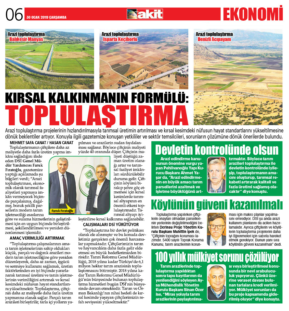 Tarım arazilerinde toplulaştırma yapıldıktan sonra tapu kayıtlarının da yenilendiğini söyleyen Aysa Mühendislik Yönetim Kurulu Başkanı Sinan Özer ise, "Miras yoluyla tarım arazilerinin paylaştırılması veya birleştirilmesi konusunda bir nevi arabuluculuk yapıyoruz. Çünkü üzerine veraset davası bulunan tarlalara kredi verilmiyor. Mülkiyet sorunları da bu proje kapsamında giderilmiş oluyor" diye konuştu.