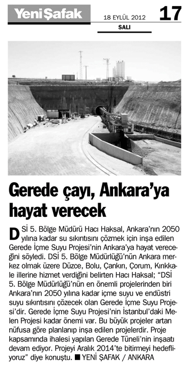 DSİ 5. Bölge Müdürlüğü'nün Ankara merkez olmak üzere Düzce, Bolu, Çankırı, Çorum, Kırıkkale illerine hizmet verdiğini belirten Hacı Haksal; 'DSİ 5. Bölge Müdürlüğü'nün en önemli projelerinden biri Ankara'nın 2050 yılına kadar içme suyu ve endüstri suyu sıkıntısını çözecek olan Gerede İçme Suyu Projesi'dir. Ankara Çamlıdere Barajı da bu kapsamda içme suyu amacıyla inşa edilmiş ve hali hazırda Ankara'nın içme suyunu karşılıyor. Gerede İçme Suyu Projesi'nin İstanbul'daki Melen Projesi kadar önemi var. Bu büyük projeler artan nüfusa göre planlanıp inşa edilen projelerdir. Şu anda Gerede İçme Suyu Projesi kapsamında ihalesi yapılan Gerede Tüneli'nin inşaatı devam ediyor. Bu proje ile Gerede Çayı'ndan yılda 226 milyon m³ su 31,5 km iletim hattı Çamlıdere Barajı'na ulaştırılacak. Ankara Gerede İçme Suyu Projesi'ni 25 Aralık 2014 tarihinde bitirmeyi hedefliyoruz' diye konuştu.