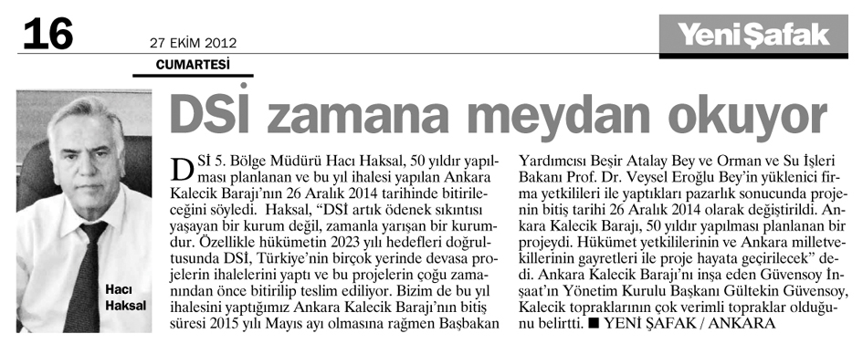Haksal, 'DSİ artık ödenek sıkıntısı yaşayan bir kurum değil, zamanla yarışan bir kurumdur. Özellikle hükümetin 2023 yılı hedefleri doğrultusunda DSİ, Türkiye'nin birçok yerinde devasa projelerin ihalelerini yaptı ve bu projelerin çoğu zamanından önce bitirilip teslim ediliyor. Bizim de bu yıl ihalesini yaptığımız Ankara Kalecik Barajı'nın bitiş süresi 2015 yılı Mayıs ayı olmasına rağmen Başbakan Yardımcısı Beşir Atalay Bey ve Orman ve Su İşleri Bakanı Prof. Dr. Veysel Eroğlu Bey'in yüklenici firma yetkilileri ile yaptıkları pazarlık sonucunda projenin bitiş tarihi 26 Aralık 2014 olarak değiştirildi. Ankara Kalecik Barajı, 50 yıldır yapılması planlanan bir projeydi. Hükümet yetkililerinin ve Ankara milletvekillerinin gayretleri ile proje hayata geçirilecek' dedi. Ankara Kalecik Barajı'nı inşa eden Güvensoy İnşaat'ın Yönetim Kurulu Başkanı Gültekin Güvensoy, Kalecik topraklarının çok verimli topraklar olduğunu belirterek; 'Kalecik'te bağcılık yörede yaşayan insanların büyük bir bölümünün geçim kaynağıdır. Kalecik Barajı'nın ihale edilmesiyle bölgedeki araziler değer kazandı, tarıma rağbet arttı. Bu anlamda Ankara Kalecik Barajı, Kalecik halkının ekonomisine muhakkak büyük katkılar sağlayacaktır. Sulanmamış arazi kalmayacaktır ve aynı proje içerisinde yöreye içme suyu da verilecektir' dedi.