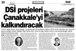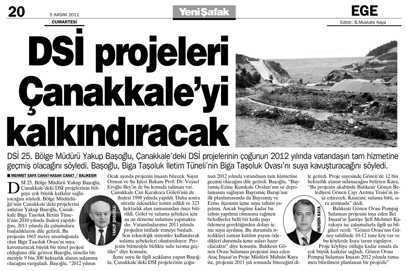 DSİ 25. Bölge Müdürü Yakup Başoğlu, Çanakkale'deki DSİ projelerinin çoğunun 2012 yılında vatandaşın tam hizmetine geçmiş olacağını söyledi. Başoğlu, Biga Taşoluk İletim Tüneli projesinin Biga Taşoluk Ovası'nı suya kavuşturacak büyük bir tünel projesi olduğunu dile getirdi.
