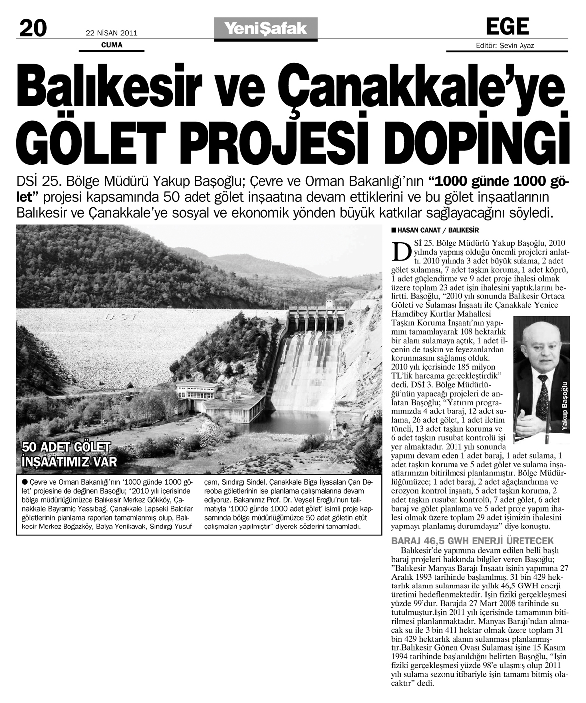 DSİ 25. Bölge Müdürlü Yakup Başoğlu, 2010 yılında yapmış olduğu önemli projeleri anlattı. 2010 yılında 3 adet büyük sulama, 2 adet gölet sulaması, 7 adet taşkın koruma, 1 adet köprü, 1 adet güçlendirme ve 9 adet proje ihalesi olmak üzere toplam 23 adet işin ihalesini yaptık.larını belirtti. Başoğlu, 'Ayrıca 2010 yılı sonunda Balıkesir Merkez Ortaca Göleti ve Sulaması İnşaatı ile Çanakkale Yenice Hamdibey Kurtlar Mahallesi Taşkın Koruma İnşaatı'nın yapımını tamamlayarak 108 hektarlık bir alanı sulamaya açtık, 1 adet ilçenin de taşkın ve feyezanlardan korunmasını sağlamış olduk. Yapılan çalışmalar neticesinde 2010 yılı içerisinde 185 milyon TL'lik harcama gerçekleştirdik' dedi. 2011 yılında DSİ 3. Bölge Müdürlüğü'nün yapacağı projeleri de anlatan Başoğlu; '2011 yılı yatırım programımızda 4 adet baraj, 12 adet sulama, 26 adet gölet, 1 adet iletim tüneli, 13 adet taşkın koruma ve 6 adet taşkın rusubat kontrolü işi yer almaktadır. 2011 yılı sonunda yapımı devam eden 1 adet baraj, 1 adet sulama, 1 adet taşkın koruma ve 5 adet gölet ve sulama inşaatlarımızın bitirilmesi planlanmıştır. Bölge Müdürlüğümüzce; 1 adet baraj, 2 adet ağaçlandırma ve erozyon kontrol inşaatı, 5 adet taşkın koruma, 2 adet taşkın rusubat kontrolü, 7 adet gölet, 6 adet baraj ve gölet planlama ve 5 adet proje yapım ihalesi olmak üzere toplam 29 adet işimizin ihalesini yapmayı planlamış durumdayız' diye konuştu.