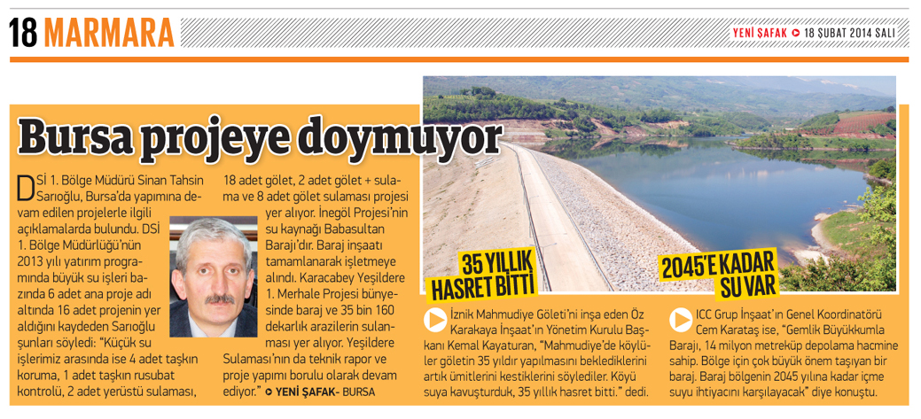 DSİ 1. Bölge Müdürü Sinan Tahsin Sarıoğlu, Bursa'da yapımına devam edilen baraj, sulama ve gölet projeleriyle ilgili açıklamalarda bulundu. Sarıoğlu, etkin bir ekip çalışması ile bölgede büyük su işlerine ve küçük su işlerine ağırlık verdiklerini söyledi. DSİ 1. Bölge Müdürlüğü'nün 2013 yılı yatırım programında büyük su işleri bazında 6 adet ana proje adı altında 16 adet projenin yer aldığını kaydeden Sarıoğlu, "Küçük su işlerimiz arasında ise 4 adet taşkın koruma, 1 adet taşkın rusubat kontrolü, 2 adet yerüstü sulaması, 18 adet gölet (GÖL-SU), 2 adet gölet + sulama (GÖL-SU) ve 8 adet gölet sulaması projesi yer alıyor. İnegöl Projesi'nin su kaynağı Babasultan Barajı'dır. Baraj inşaatı tamamlanarak işletmeye alındı. Babasultan Barajı Sulaması projesinin sulama alanı 41 bin dekar. Bir diğer önemli projemiz olan Bursa Karacabey Yeşildere 1. Merhale Projesi bünyesinde baraj ve 35 bin 160 dekarlık arazilerin sulanması yer alıyor. Yeşildere Sulaması'nın da teknik rapor ve proje yapımı borulu olarak devam ediyor. Bu proje sayesinde de 35 bin 160 dekarlık mümbit tarım arazileri suya kavuşacak. DSİ 1. Bölge Müdürlüğü'nde 2014 yılında birçok proje tamamlanarak halkın hizmetine sunulacak.' dedi.