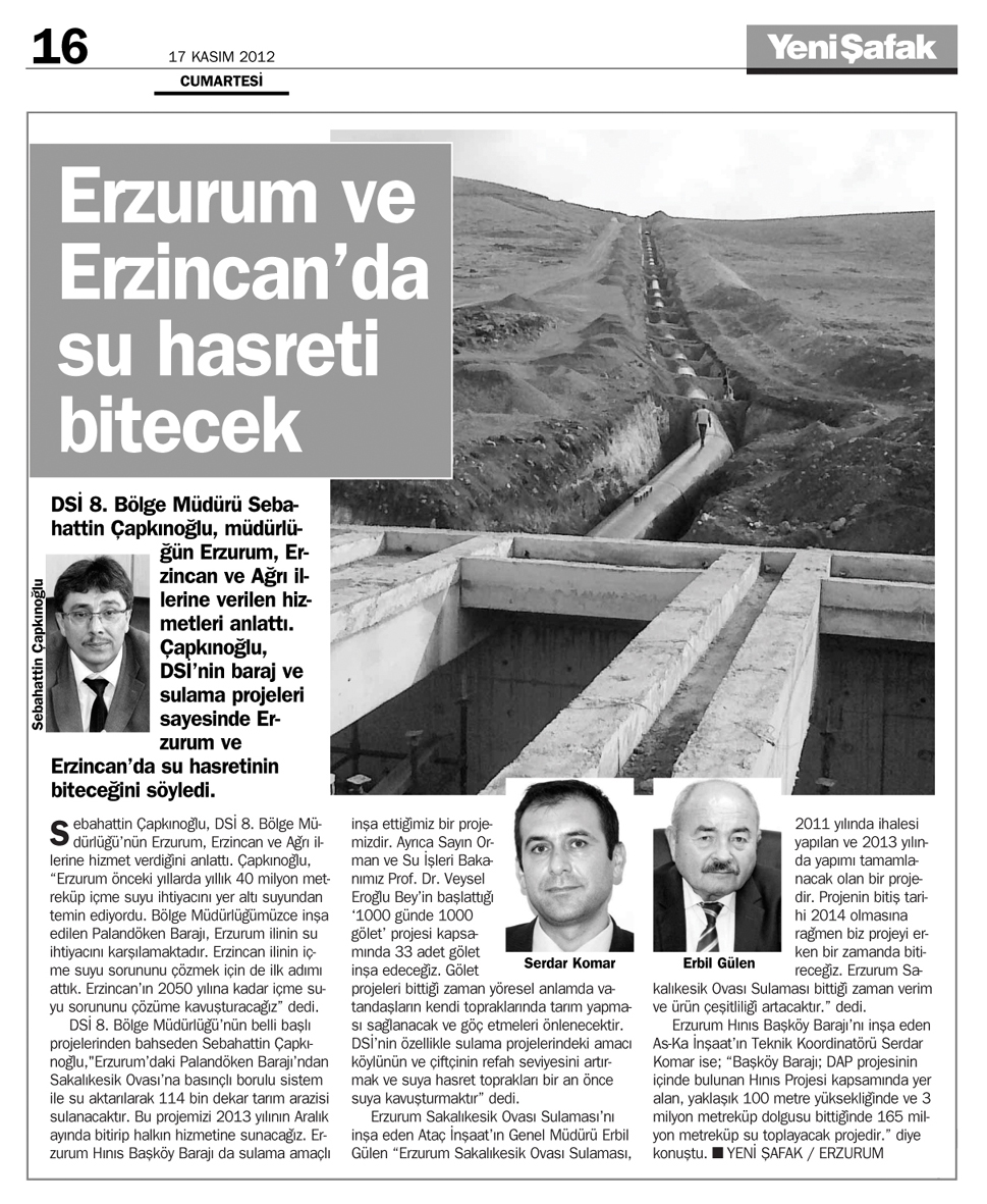 Erzurum Sakalıkesik Ovası Sulaması'nı inşa eden Ataç İnşaat'ın Genel Müdürü Erbil Gülen 'Erzurum Sakalıkesik Ovası Sulaması, 2011 yılında ihalesi yapılan ve 2013 yılında yapımı tamamlanacak olan bir projedir. Projenin bitiş tarihi 2014 olmasına rağmen biz projeyi erken bir zamanda bitireceğiz. Erzurum Sakalıkesik Ovası Sulaması bittiği zaman verim ve ürün çeşitliliği artacaktır. Kısacası bu proje bölgeye hayat verecektir' dedi.