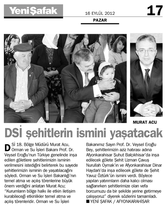 Orman ve Su İşleri Bakanlığı'nın temel atma ve açılış törenlerine büyük önem verdiğini anlatan Murat Acu; 'Kurumların bölge halkı ile etkin iletişim kurabileceği etkinlikler temel atma ve açılış törenleridir. Orman ve Su İşleri Bakanımız Sayın Prof. Dr. Veysel Eroğlu Bey, şehitlerimizin aziz hatırası adına Afyonkarahisar Şuhut Balçıkhisar'da inşa edilecek gölete Şehit Uzman Çavuş Nurullah Oymak'ın ve Afyonkarahisar Dinar Haydarlı'da inşa edilecek gölete de Şehit Yavuz Öztürk'ün ismini verdi. Böylece yapılan yatırımların daha kalıcı olması sağlanırken şehitlerimize olan vefa borcumuzu da bir şekilde yerine getirmeye çalışıyoruz' diyerek sözlerini tamamladı.