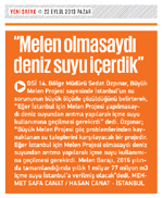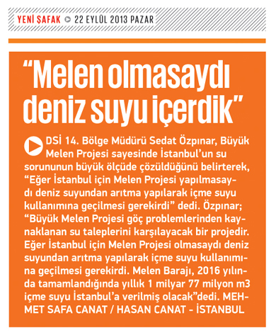 DSİ 14. Bölge Müdürü Sedat Özpınar, Büyük Melen Projesi sayesinde İstanbul'un su sorununun büyük ölçüde çözüldüğünü belirterek, "Eğer İstanbul için Melen Projesi yapılmasaydı deniz suyundan arıtma yapılarak içme suyu kullanımına geçilmesi gerekirdi" dedi. Özpınar; "Büyük Melen Projesi göç problemlerinden kaynaklanan su taleplerini karşılayacak bir projedir. Eğer İstanbul için Melen Projesi olmasaydı deniz suyundan arıtma yapılarak içme suyu kullanımına geçilmesi gerekirdi. Melen Barajı, 2016 yılında tamamlandığında yıllık 1 milyar 77 milyon m³ içme suyu İstanbul'a verilmiş olacak" dedi.