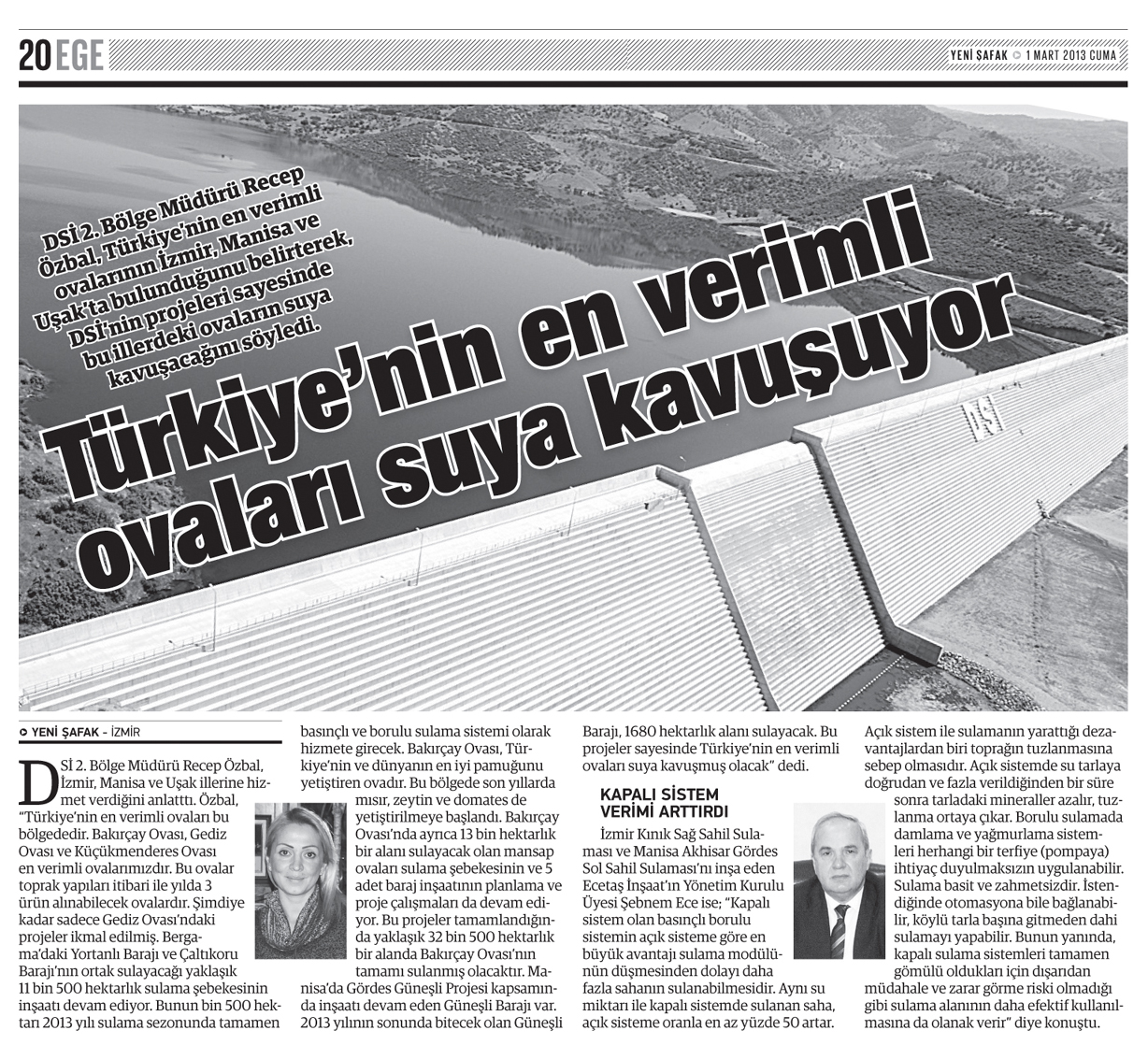 İzmir Kınık Sağ Sahil Sulaması ve Manisa Akhisar Gördes Sol Sahil Sulaması'nı inşa eden Ecetaş İnşaat'ın Yönetim Kurulu Üyesi Şebnem Ece ise; "Kapalı sistem olan basınçlı borulu sistemin açık sisteme göre en büyük avantajı sulama modülünün düşmesinden dolayı daha fazla sahanın sulanabilmesidir. Aynı su miktarı ile kapalı sistemde sulanan saha, açık sisteme oranla en az yüzde 50 artar. Açık sistem ile sulamanın yarattığı dezavantajlardan biri toprağın tuzlanmasına sebep olmasıdır. Açık sistemde su tarlaya doğrudan ve fazla verildiğinden bir süre sonra tarladaki mineraller azalır, tuzlanma ortaya çıkar. Borulu sulamada damlama ve yağmurlama sistemleri herhangi bir terfiye (pompaya) ihtiyaç duyulmaksızın uygulanabilir. Sulama basit ve zahmetsizdir. İstendiğinde otomasyona bile bağlanabilir, köylü tarla başına gitmeden dahi sulamayı yapabilir. Bunun yanında, kapalı sulama sistemleri tamamen gömülü oldukları için dışarıdan müdahale ve zarar görme riski olmadığı gibi sulama alanının daha efektif kullanılmasına da olanak verir" diye konuştu.