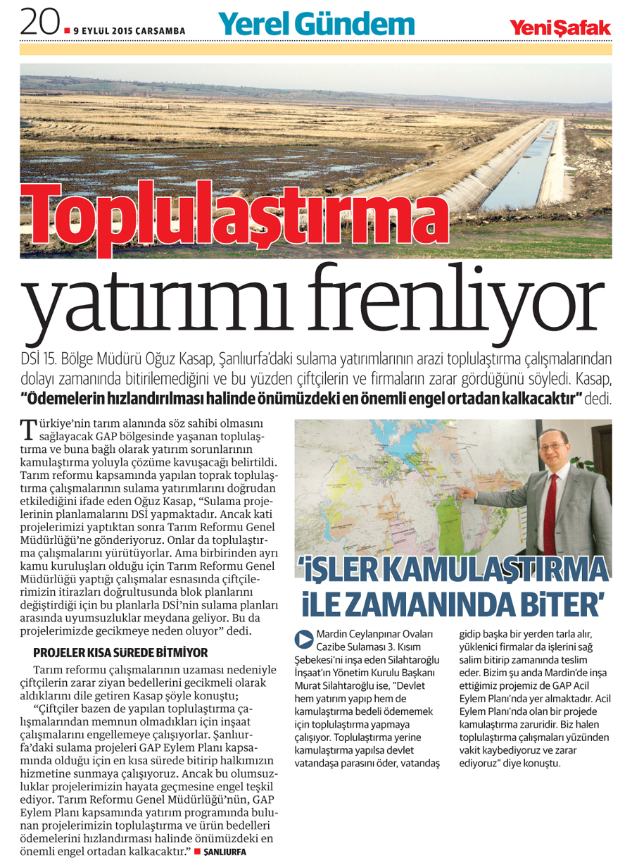 DSİ 15. Bölge Müdürü Oğuz Kasap, Şanlıurfa'daki sulama yatırımlarının arazi toplulaştırma çalışmalarından dolayı zamanında bitirilemediğini ve bu yüzden çiftçilerin ve firmaların zarar gördüğünü söyledi. Kasap, "Ödemelerin hızlandırılması halinde önümüzdeki en önemli engel ortadan kalkacaktır" dedi.