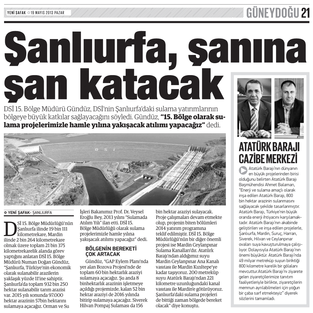 Gündüz, "GAP Eylem Planı'nda yer alan Bozova Projesi'nde de toplam 60 bin hektarlık araziyi sulamaya açacağız. Şu anda 8 binhektarlık arazinin işletmeye açıldığı projemizde, kalan 52 bin hektar araziyi de 2016 yılında bitirip sulamaya açacağız. Siverek Hilvan Pompaj Sulaması da 156 bin hektar araziyi sulayacak. Proje çalışmaları devam etmekte olup, projenin biten bölümleri 2014 yatırım programına teklif edilmiştir. DSİ 15. Bölge Müdürlüğü'nün bir diğer önemli projesi ise Mardin Ceylanpınar Sulama Kanalları'dır. Atatürk Barajı'ndan aldığımız suyu Mardin Ceylanpınar Ana Kanalı vasıtası ile Mardin Kızıltepe'ye kadar taşıyoruz. 200 metreküp suyu Atatürk Barajı'ndan 221 kilometre uzunluğundaki kanal vasıtası ile Mardin'e götürüyoruz. Şanlıurfa'daki sulama projeleri de bittiği zaman bölgede bereket olacak' dedi.
