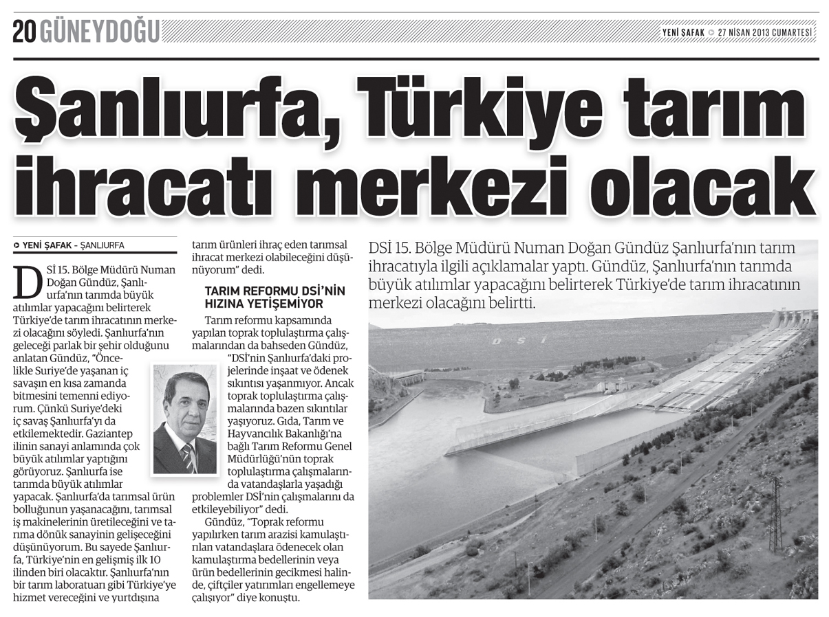 Baraj DSİ 15. Bölge Müdürü Numan Doğan Gündüz, Şanlıurfa'nın tarımda büyük atılımlar yapacağını belirterek Türkiye'de tarım ihracatının merkezi olacağını söyledi. Şanlıurfa'nın geleceği parlak bir şehir olduğunu anlatan Gündüz, 'Öncelikle Suriye'de yaşanan iç savaşın en kısa zamanda bitmesini temenni ediyorum. Çünkü Suriye'deki iç savaş Şanlıurfa'yı da etkilemektedir. Gaziantep ilinin sanayi anlamında çok büyük atılımlar yaptığını görüyoruz. Şanlıurfa ise tarımda büyük atılımlar yapacak. Şanlıurfa'da tarımsal ürün bolluğunun yaşanacağını, tarımsal iş makinelerinin üretileceğini ve tarıma dönük sanayinin gelişeceğini düşünüyorum. Bu sayede Şanlıurfa, Türkiye'nin en gelişmiş ilk 10 ilinden biri olacaktır. Şanlıurfa'nın bir tarım laboratuarı gibi Türkiye'ye hizmet vereceğini ve yurtdışına tarım ürünleri ihraç eden tarımsal ihracat merkezi olabileceğini düşünüyorum' dedi.