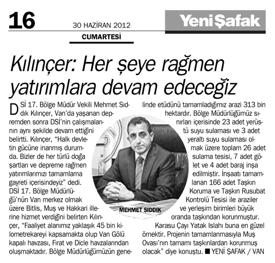 Kılınçer, 'Halk devletin gücüne inanmış durumda. Bizler de her türlü doğa şartları ve depreme rağmen yatırımlarımızı tamamlama gayreti içerisindeyiz' dedi. DSİ 17. Bölge Müdürlüğü'nün Van merkez olmak üzere Bitlis, Muş ve Hakkari illerine hizmet verdiğini belirten Mehmet Sıddık Kılınçer, 'Faaliyet alanımız yaklaşık 45 bin kilometrekareyi kapsamakta olup Van Gölü kapalı havzası, Fırat ve Dicle havzalarından oluşmaktadır. Bölge Müdürlüğümüzün genelinde etüdünü tamamladığımız arazi 313 bin hektardır. Bölgemizdeki DSİ projeleri genellikle enerji ve sulama amaçlı inşa edilmektedir. Bölgemizde halen 6 adet baraj ve çok sayıda sulama inşaatının yapımı devam etmektedir. Bölge Müdürlüğümüz sınırları içerisinde 23 adet yerüstü suyu sulaması ve 3 adet yeraltı suyu sulaması olmak üzere toplam 26 adet sulama tesisi, 7 adet gölet ve 4 adet baraj inşa edilmiştir. İnşaatı tamamlanan 166 adet Taşkın Koruma ve Taşkın Rusubat Kontrolü Tesisi ile araziler ve yerleşim birimleri büyük oranda taşkından korunmuştur. İnşa edilen bu tesislerle son yıllarda bölgemizde önemli sayılabilecek taşkın olayı yaşanmamıştır. Muş Ovası'nda inşaatı devam eden Karasu Çayı Yatak Islahı buna en güzel örnektir. Projenin tamamlanmasıyla Muş Ovası'nın tamamı taşkınlardan korunmuş olacaktır. Bölge Müdürlüğümüzce inşaatı tamamlanan ve işletmede olan sulamalarımızın büyük çoğunluğu sulama birliklerine devredilmiştir. Bu kapsamda oluşturulan 11 adet sulama birliği ile bu sulamaların işletme ve bakım onarımları yapılmaktadır. Sulamaların devri ile bölge insanına aynı zamanda istihdam olanağı da sağlanmıştır' diye konuştu.