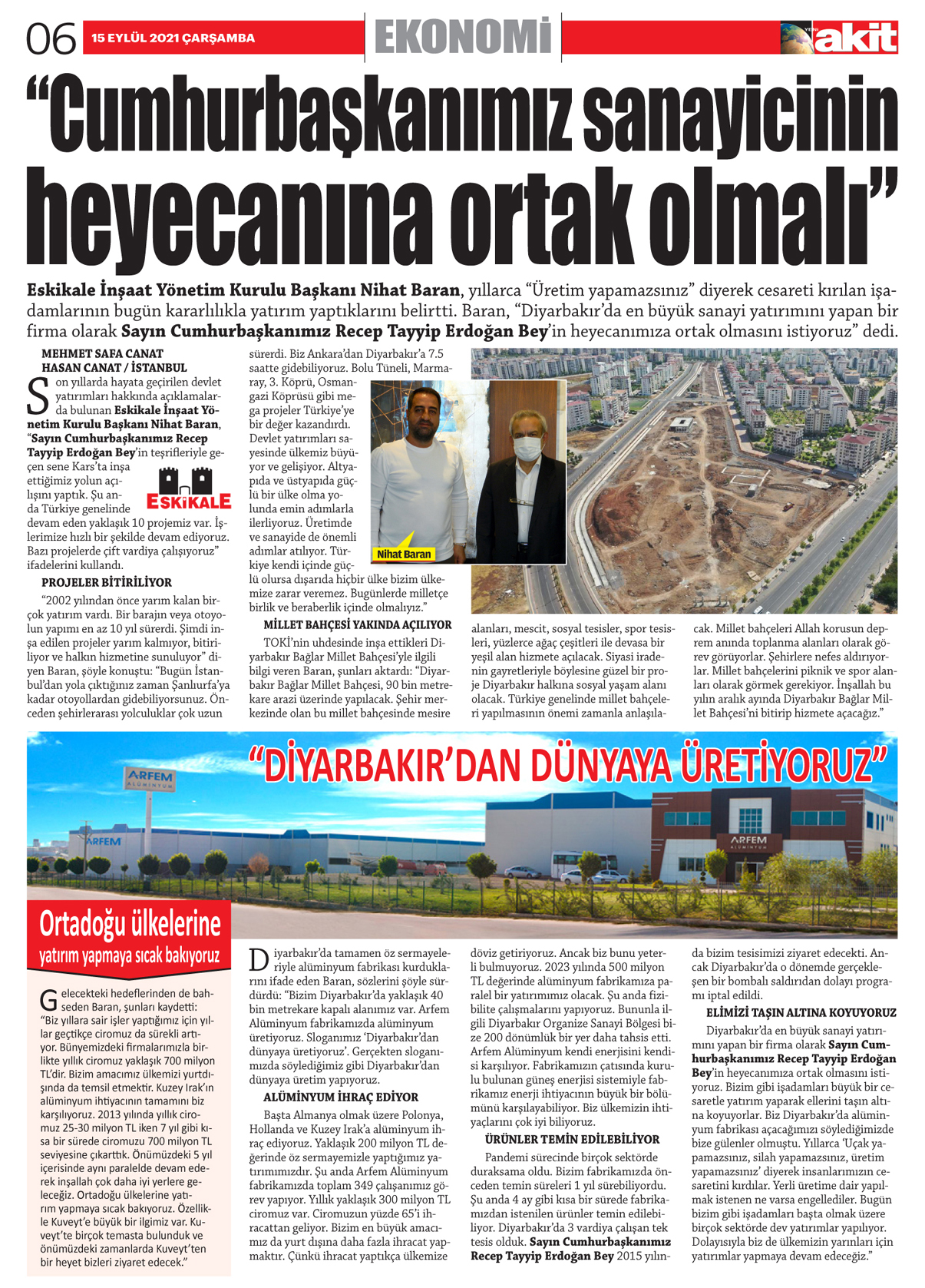 Eskikale İnşaat Yönetim Kurulu Başkanı Nihat Baran, yıllarca "Üretim yapamazsınız" diyerek cesareti kırılan işadamlarının bugün kararlılıkla yatırım yaptıklarını belirtti. Baran, "Diyarbakır'da en büyük sanayi yatırımını yapan bir firma olarak Sayın Cumhurbaşkanımız Recep Tayyip Erdoğan Bey'in heyecanımıza ortak olmasını istiyoruz" dedi.