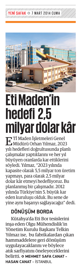 ETİ Maden İşletmeleri Genel Müdürü Orhan Yılmaz, 2023 yılı hedefleri doğrultusunda planlı çalışmalar yaptıklarını ve her yıl büyüyen oranlarda kar ettiklerini söyledi.