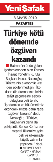 Batman'ın önde gelen işadamlarından olan Fernas İnşaat Yönetim Kurulu Başkanı Necat Nasıroğlu; Türkiye'nin ekonomik krizden etkilenmediğini, İktidarın dik durmasının krizin teğet geçmesine sebep olduğunu belirterek, 'İşadamları ve hükümetimiz ekonomik krizde daha fazla özgüven kazandı' dedi. Nasıroğlu; 'Türkiye, özgüvenini daha da pekiştirdi. Bence Körfez sermayesi ülkemize gelecek ve ülkemizde büyük yatırımlar yapılacak' dedi.
