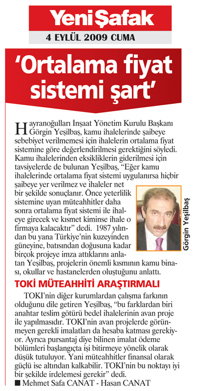 Hayranoğulları İnşaat Yönetim Kurulu Başkanı Görgin Yeşilbaş, kamu ihalelerinde şaibeye sebebiyet verilmemesi için ihalelerin ortalama fiyat sistemine göre değerlendirilmesi gerektiğini söyledi.