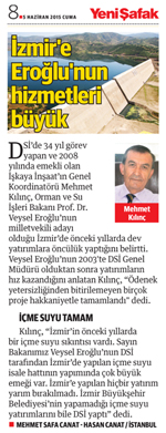 DSİ'de 34 yıl görev yapan ve 2008 yılında emekli olan İşkaya İnşaat'ın Genel Koordinatörü Mehmet Kılınç, Orman ve Su İşleri Bakanı Prof. Dr. Veysel Eroğlu'nun milletvekili adayı olduğu İzmir'de önceki yıllarda dev yatırımlara öncülük yaptığını belirtti.