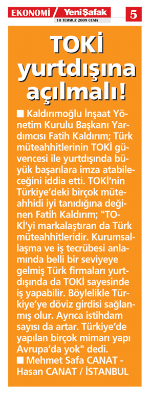 Kaldırımoğlu İnşaat Yönetim Kurulu Başkanı Yardımcısı Fatih Kaldırım; Türk müteahhitlerinin TOKİ güvencesi ile yurtdışında büyük başarılara imza atabileceğini iddia etti. TOKİ'nin Türkiye'deki birçok müteahhidi iyi tanıdığına değinen Fatih Kaldırım; 'TOKİ'yi markalaştıran da Türk müteahhitleridir. Kurumsallaşma ve iş tecrübesi anlamında belli bir seviyeye gelmiş Türk firmaları yurtdışında da TOKİ sayesinde iş yapabilir. Böylelikle Türkiye'ye döviz girdisi sağlanmış olur. Ayrıca istihdam sayısı da artar. Türkiye'de yapılan birçok mimarı yapı Avrupa'da yok' dedi.