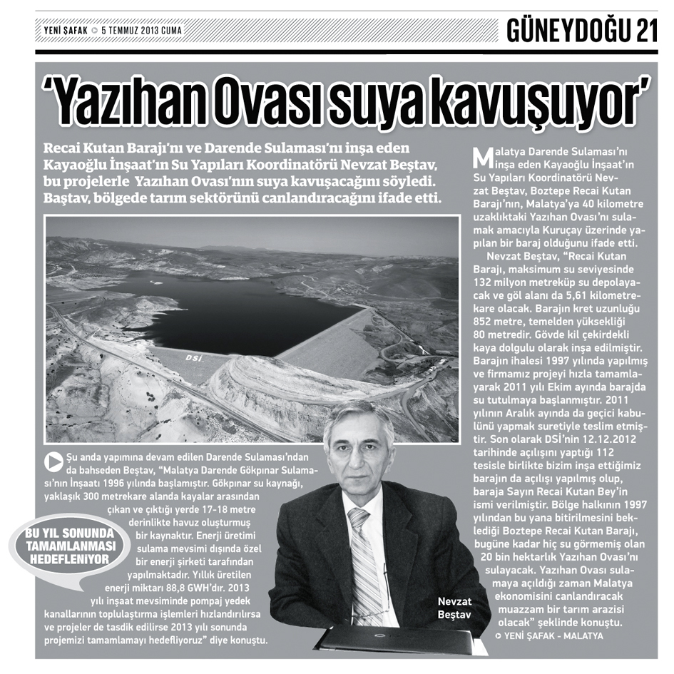 Recai Kutan Barajı'nı ve şu anda yapımı devam eden Darende Sulaması'nı inşa eden Kayaoğlu İnşaat'ın Su Yapıları Koordinatörü Nevzat Beştav, bu projelerin Malatya'nın en kurak ovası olan Yazıhan Ovası'nı suya kavuşturacağını söyledi. Baştav, bölgede tarım sektörünü canlandıracağını ifade etti.