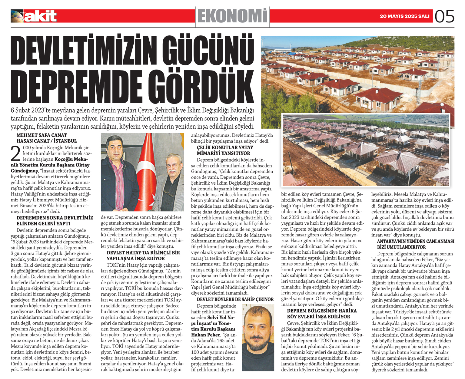 Devletimizin gücünü depremde gördük Yeni Akit Gazetesi / 20.05.2025 6 Şubat 2023'te meydana gelen depremin yaraları Çevre, Şehircilik ve İklim Değişikliği Bakanlığı tarafından sarılmaya devam ediyor. Kamu müteahhitleri, devletin depremden sonra elinden geleni yaptığını, felaketin yaralarının sarıldığını, köylerin ve şehirlerin yeniden inşa edildiğini söyledi. 2000 yılında Koçoğlu Mekanik şirketini kurduklarını belirterek sözlerine başlayan Koçoğlu Mekanik Yönetim Kurulu Başkanı Oktay Gündoğmuş, "İnşaat sektöründeki faaliyetlerimizi devam ettirerek bugünlere geldik. Şu an Malatya ve Kahramanmaraş'ta hafif çelik konutlar inşa ediyoruz. Hatay Valiliği'nin uhdesinde inşa ettiğimiz Hatay İl Emniyet Müdürlüğü Hizmet Binası'nı 2026'da bitirip teslim etmeyi hedefliyoruz" dedi. Depremden sonra devletimiz elinden geleni yaptı Devletin depremden sonra bölgede yaptığı çalışmaları anlatan Gündoğmuş, "6 Şubat 2023 tarihindeki depremde Mersin'deki şantiyemizdeydik. Depremden 3 gün sonra Hatay'a gittik. Şehre giremiyorduk, yollar kapanmıştı ve her taraf enkazdı. Ta ki devletin gücünü bizzat yerinde gördüğümüzde içimiz bir nebze de olsa rahatladı. Devletimizin büyüklüğünü kelimelerle ifade edemeyiz. Devletin sahada çalışan ekiplerini, bürokratlarını, teknikerlerini bizzat sahaya gidip görmeniz gerekiyor. Biz Malatya'nın ve Kahramanmaraş'ın köylerinde deprem konutları inşa ediyoruz. Devletin bir tane ev için bütün imkânlarını nasıl seferber ettiğini burada değil, orada yaşayanlar görüyor. Malatya'nın Akçadağ ilçesindeki Mezra köyü rakım olarak yüksek bir yerdedir. Baksanız oraya ne beton, ne de demir çıkar. Mezra köyünde inşa edilen deprem konutları için devletimiz o köye demiri, betonu, ekibi, elektriği, suyu, her şeyi götürdü. İnşa edilen konut sayısının önemi yok. Devletimiz memleketin her köşesinde var. Depremden sonra başka şehirlere göç etmek zorunda kalan insanlar şimdi memleketlerine huzurla dönüyorlar. Çünkü devletimiz elinden geleni yaptı, depremdeki felaketin yaraları sarıldı ve şehirler yeniden inşa edildi" diye konuştu. Devlet Hatay'da bilinçli bir yapılaşma inşa ediyor TOKİ'nin Hatay için yaptığı çalışmaları değerlendiren Gündoğmuş, "Zemin etütleri doğrultusunda deprem bölgesinde çok iyi zemin iyileştirme çalışmaları yapılıyor. TOKİ bu konuda hassas davranıyor. Hatay'ın eski siluetindeki çarşıları ve ana ticaret merkezlerini TOKİ aynı şekilde inşa etmeye çalışıyor. Sadece bu düzen içindeki yeni yerleşim alanları şehrin dışına doğru taşınıyor. Çünkü şehri de rahatlatmak gerekiyor. Depremden önce Hatay'da yol ve köprü çalışmaları yoktu. Şu an yeniden inşa edilen yollar ve köprüler Hatay'ı başlı başına yeniliyor. TOKİ sayesinde Hatay modernleşiyor. Yeni yerleşim alanları ile beraber yollar, hastaneler, karakollar, camiler, çarşılar da yenileniyor. Hatay'a genel olarak baktığınızda şehrin modernleştiğini anlayabiliyorsunuz. Devletimiz Hatay'da bilinçli bir yapılaşma inşa ediyor" dedi. Çelik konutlar yatay mimariyi yansıtıyor Deprem bölgesindeki köylerde inşa edilen çelik konutlardan da bahseden Gündoğmuş, "Çelik konutlar depremden önce de vardı. Depremden sonra Çevre, Şehircilik ve İklim Değişikliği Bakanlığı bu konuda kapsamlı bir araştırma yaptı. Köylerde inşa edilecek konutların hem beton yükünden kurtulması, hem hızlı bir şekilde inşa edilebilmesi, hem de depreme daha dayanıklı olabilmesi için bir hafif çelik konut sistemi geliştirildi. Çok katlı yapılar olmadığı için hafif çelik konutlar yatay mimarinin de en güzel örneklerinden biri oldu. Biz de Malatya ve Kahramanmaraş'taki bazı köylerde hafif çelik konutlar inşa ediyoruz. Fiziki seviye olarak yüzde 70'e geldik. Kahramanmaraş'ta teslim edilmeye hazır olan konutlarımız var. Biz üstyapı çalışmalarını inşa edip teslim ettikten sonra altyapı çalışmaları farklı bir ihale ile yapılıyor. Konutların ne zaman teslim edileceğini Yapı İşleri Genel Müdürlüğü belirliyor" diyerek sözlerini tamamladı. Devlet köylere de sahip çıkıyor Deprem bölgesinde hafif çelik konutlar inşa eden Selvi Yol Yapı İnşaat'ın Yönetim Kurulu Başkanı Hakan Peker, "Şu anda Adana'da 165 adet ve Kahramanmaraş'ta 100 adet yapımı devam eden hafif çelik konut projelerimiz var. Hafif çelik konut diye tabir edilen köy evleri tamamen Çevre, Şehircilik ve İklim Değişikliği Bakanlığı'na bağlı Yapı İşleri Genel Müdürlüğü'nün uhdesinde inşa ediliyor. Köy evleri 6 Şubat 2023 tarihindeki depremden sonra yaygınlaştı ve hızlı bir şekilde devam ediyor. Deprem bölgesindeki köylerde depremde hasar gören evlerle karşılaşıyoruz. Hasar gören köy evlerinin yıkımı ve enkazın kaldırılması belediyeye aittir. Biz işimiz hızlı ilerlesin diye birçok yıkımı kendimiz yaptık. İşimizi ilerletirken miras sorunları çıkıyor veya hafif çelik konut yerine betonarme konut isteyen hak sahipleri oluyor. Çelik yapılı köy evleri vatandaşlara detaylı bir şekilde anlatılmalıdır. İnşa ettiğimiz köy evleri köylerin sosyal dokusunu ve doğallığını çok güzel yansıtıyor. O köy evlerini gördükçe insanın köye yerleşesi geliyor" dedi. Deprem bölgesinde harika köy evleri inşa ediliyor Çevre, Şehircilik ve İklim Değişikliği Bakanlığı'nın köy evleri projesini başarılı bulduklarını söyleyen Peker, "6 Şubat'taki depremde TOKİ'nin inşa ettiği hiçbir konut yıkılmadı. Şu an bizim inşa ettiğimiz köy evleri de sağlam, donanımlı ve depreme dayanıklıdır. Bu anlamda ileriye dönük baktığımız zaman devletin köylere de sahip çıktığını söyleyebiliriz. Mesela Malatya ve Kahramanmaraş'ta harika köy evleri inşa edildi. Sağlam zem