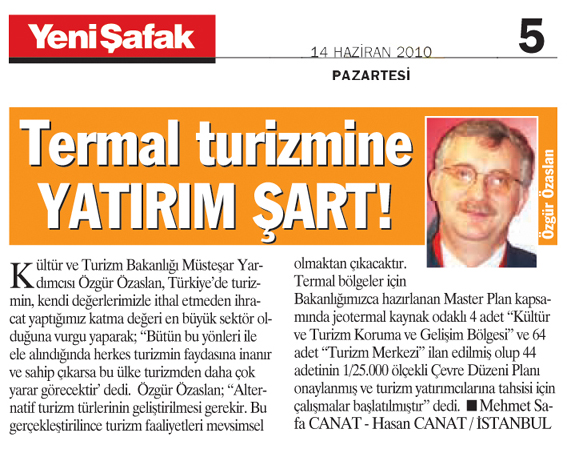 Kültür ve Turizm Bakanlığı Müsteşar Yardımcısı Özgür Özaslan, Türkiye'de turizmin, kendi değerlerimizle ithal etmeden ihracat yaptığımız katma değeri en büyük sektör olduğuna vurgu yaparak; "Bütün bu yönleri ile ele alındığında herkes turizmin faydasına inanır ve sahip çıkarsa bu ülke turizmden daha çok yarar görecektir' dedi. Özgür Özaslan; "Alternatif turizm türlerinin geliştirilmesi gerekir. Bu gerçekleştirilince turizm faaliyetleri mevsimsel olmaktan çıkacaktır. Termal bölgeler için Bakanlığımızca hazırlanan Master Plan kapsamında jeotermal kaynak odaklı 4 adet "Kültür ve Turizm Koruma ve Gelişim Bölgesi" ve 64 adet "Turizm Merkezi" ilan edilmiş olup 44 adetinin 1/25.000 ölçekli Çevre Düzeni Planı onaylanmış ve turizm yatırımcılarına tahsisi için çalışmalar başlatılmıştır" dedi.