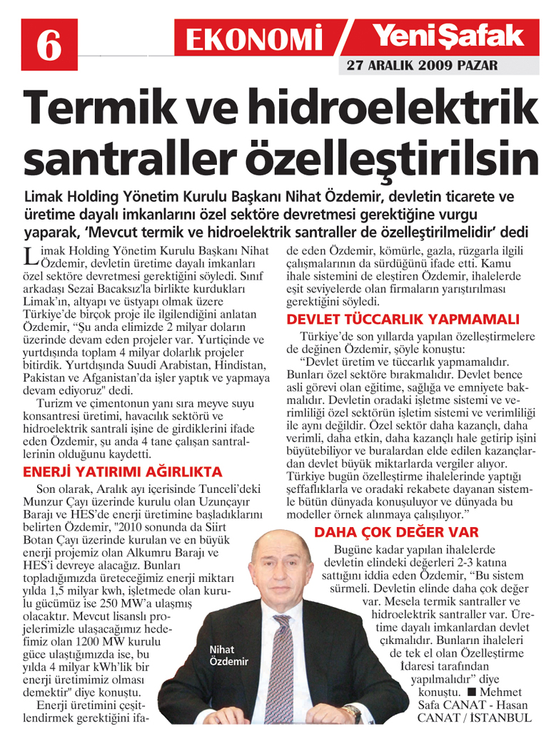 Limak Holding Yönetim Kurulu Başkanı Nihat Özdemir, devletin üretime dayalı imkanları özel sektöre devretmesi gerektiğini söyledi. Sınıf arkadaşı Sezai Bacaksız'la birlikte kurdukları Limak'ın, altyapı ve üstyapı olmak üzere Türkiye'de birçok proje ile ilgilendiğini anlatan Özdemir, 'Şu anda elimizde 2 milyar doların üzerinde devam eden projeler var. Yurtiçinde ve yurtdışında toplam 4 milyar dolarlık projeler bitirdik. Yurtdışında Suudi Arabistan, Hindistan, Pakistan ve Afganistan'da işler yaptık ve yapmaya devam ediyoruz' dedi. Turizm ve çimentonun yanı sıra meyve suyu konsantresi üretimi, havacılık sektörü ve hidroelektrik santrali işine de girdiklerini ifade eden Özdemir, şu anda 4 tane çalışan santrallerinin olduğunu kaydetti.