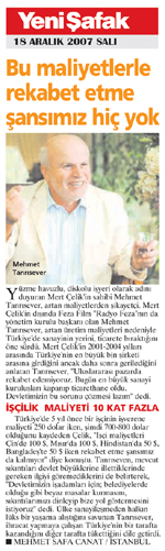 Yüzme havuzlu, diskolu işyeri olarak adını duyuran Mert Çelik'in sahibi Mehmet Tanrısever, artan maliyetlerden şikayetçi. Mert Çelik'in dışında Feza Film 'Radyo Feza'nın da yönetim kurulu başkanı olan Mehmet Tanrısever, artan üretim maliyetleri nedeniyle Türkiye'de sanayinin yerini, ticarete bıraktığını öne sürdü. Mert Çelik'in 2001-2004 yılları arasında Türkiye'nin en büyük bin şirketi arasına girdiğini ancak daha sonra gerilediğini anlatan Tanrısever, 'Uluslararası pazarda rekabet edemiyoruz. Bugün en büyük sanayi kuruluşları kapanıp ticarethane oldu. Devletimizin bu sorunu çözmesi lazım' dedi.