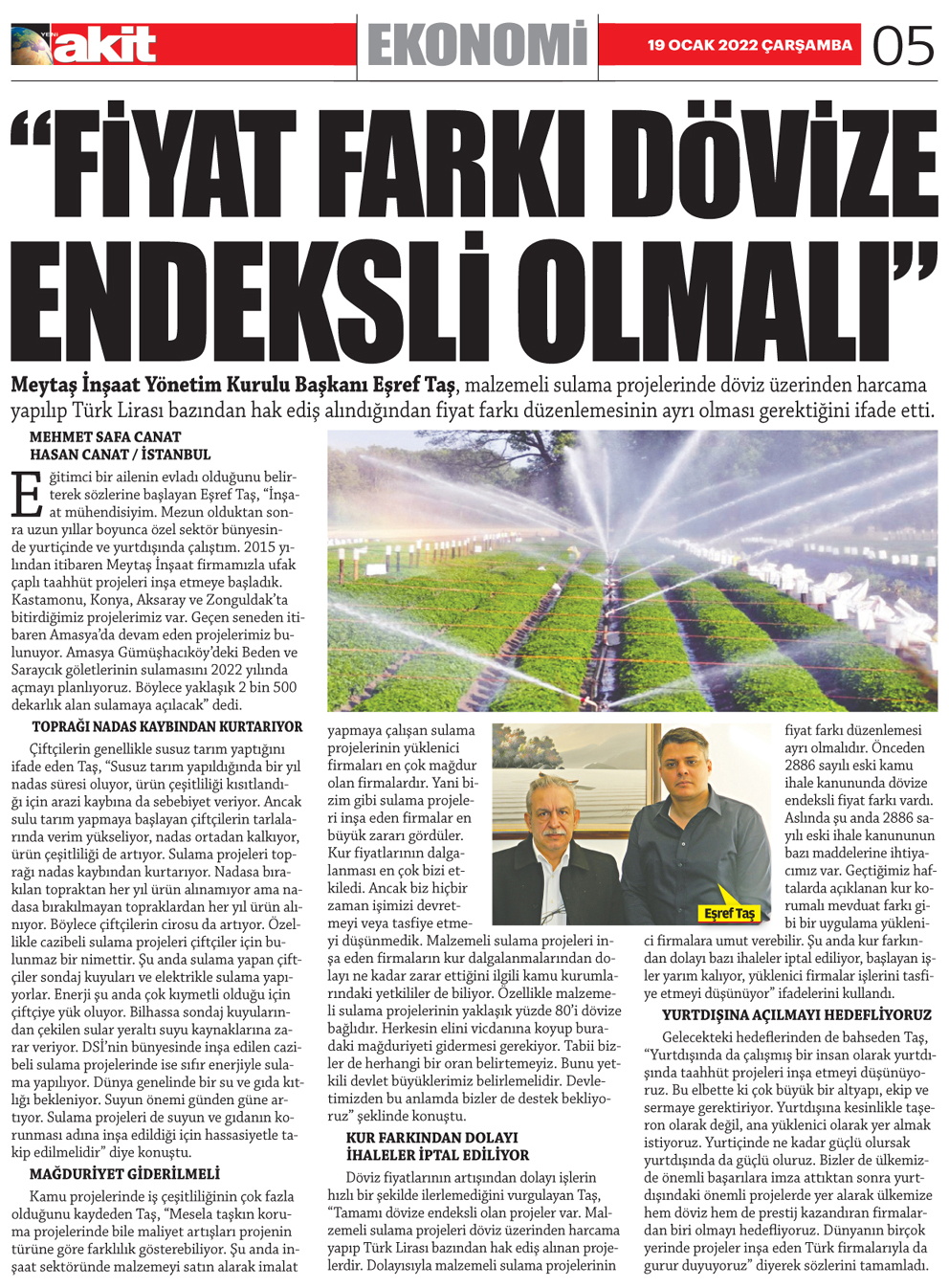 Meytaş İnşaat Yönetim Kurulu Başkanı Eşref Taş, malzemeli sulama projelerinde döviz üzerinden harcama yapılıp Türk Lirası bazından hak ediş alındığından fiyat farkı düzenlemesinin ayrı olması gerektiğini ifade etti.