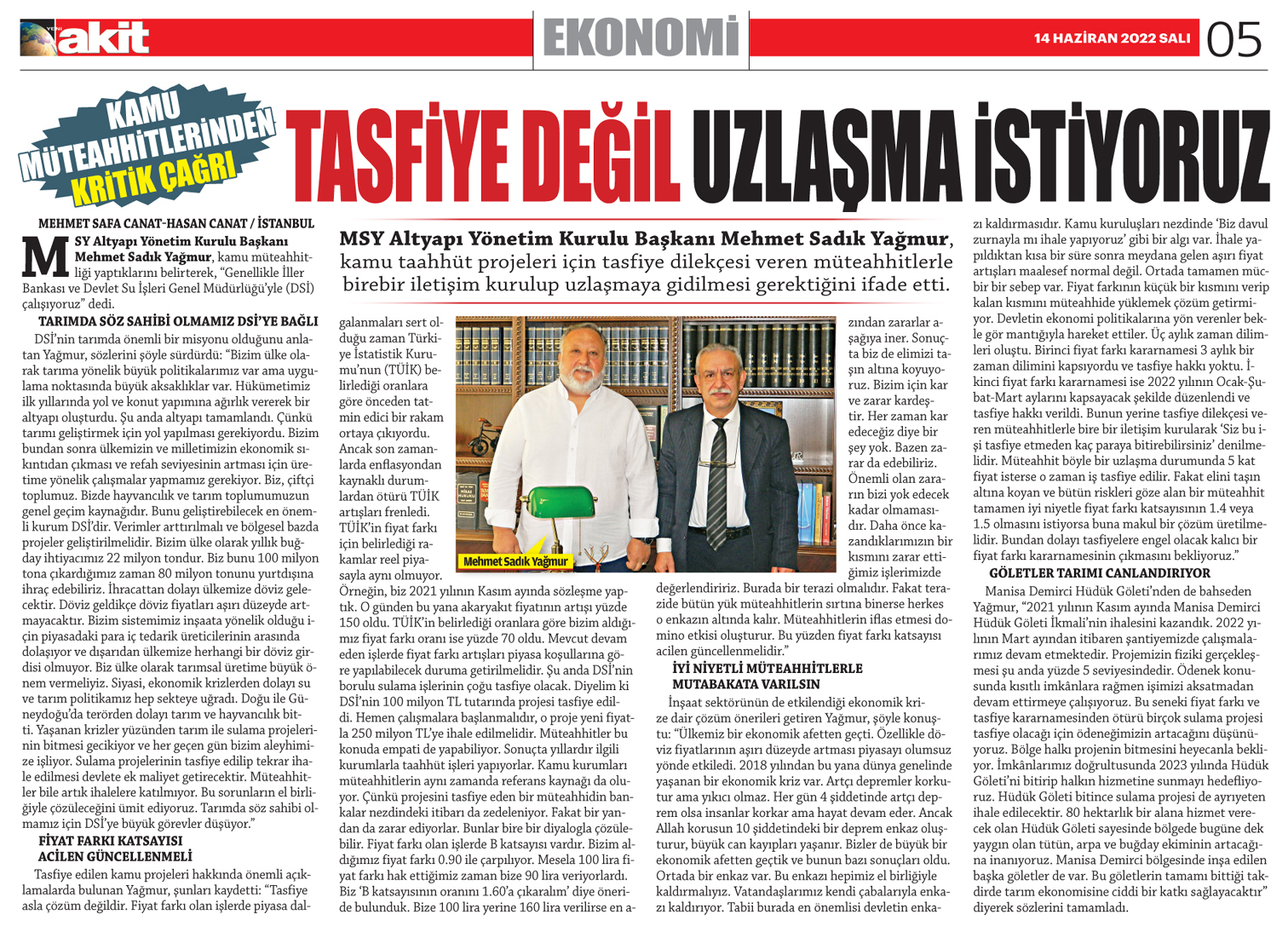 Tasfiye değil uzlaşma istiyoruz Yeni Akit Gazetesi / 14.06.2022 MSY Altyapı Yönetim Kurulu Başkanı Mehmet Sadık Yağmur, kamu taahhüt projeleri için tasfiye dilekçesi veren müteahhitlerle birebir iletişim kurulup uzlaşmaya gidilmesi gerektiğini ifade etti. MSY Altyapı Yönetim Kurulu Başkanı Mehmet Sadık Yağmur, kamu müteahhitliği yaptıklarını belirterek, "Genellikle İller Bankası ve Devlet Su İşleri Genel Müdürlüğü'yle (DSİ) çalışıyoruz" dedi. Tarımda söz sahibi olmamız DSİ'ye bağlı DSİ'nin tarımda önemli bir misyonu olduğunu anlatan Yağmur, sözlerini şöyle sürdürdü: "Bizim ülke olarak tarıma yönelik büyük politikalarımız var ama uygulama noktasında büyük aksaklıklar var. Hükümetimiz ilk yıllarında yol ve konut yapımına ağırlık vererek bir altyapı oluşturdu. Şu anda altyapı tamamlandı. Çünkü tarımı geliştirmek için yol yapılması gerekiyordu. Bizim bundan sonra ülkemizin ve milletimizin ekonomik sıkıntıdan çıkması ve refah seviyesinin artması için üretime yönelik çalışmalar yapmamız gerekiyor. Biz, çiftçi toplumuz. Bizde hayvancılık ve tarım toplumumuzun genel geçim kaynağıdır. Bunu geliştirebilecek en önemli kurum DSİ'dir. Verimler arttırılmalı ve bölgesel bazda projeler geliştirilmelidir. Bizim ülke olarak yıllık buğday ihtiyacımız 22 milyon tondur. Biz bunu 100 milyon tona çıkardığımız zaman 80 milyon tonunu yurtdışına ihraç edebiliriz. İhracattan dolayı ülkemize döviz gelecektir. Döviz geldikçe döviz fiyatları aşırı düzeyde artmayacaktır. Bizim sistemimiz inşaata yönelik olduğu için piyasadaki para iç tedarik üreticilerinin arasında dolaşıyor ve dışarıdan ülkemize herhangi bir döviz girdisi olmuyor. Biz ülke olarak tarımsal üretime büyük önem vermeliyiz. Siyasi, ekonomik krizlerden dolayı su ve tarım politikamız hep sekteye uğradı. Doğu ile Güneydoğu'da terörden dolayı tarım ve hayvancılık bitti. Yaşanan krizler yüzünden tarım ile sulama projelerinin bitmesi gecikiyor ve her geçen gün bizim aleyhimize işliyor. Sulama projelerinin tasfiye edilip tekrar ihale edilmesi devlete ek maliyet getirecektir. Müteahhitler bile artık ihalelere katılmıyor. Bu sorunların el birliğiyle çözüleceğini ümit ediyoruz. Tarımda söz sahibi olmamız için DSİ'ye büyük görevler düşüyor." Fiyat farkı katsayı acilen güncellenmeli Tasfiye edilen kamu projeleri hakkında önemli açıklamalarda bulunan Yağmur, şunları kaydetti: "Tasfiye asla çözüm değildir. Fiyat farkı olan işlerde piyasa dalgalanmaları sert olduğu zaman Türkiye İstatistik Kurumu'nun (TÜİK) belirlediği oranlara göre önceden tatmin edici bir rakam ortaya çıkıyordu. Ancak son zamanlarda enflasyondan kaynaklı durumlardan ötürü TÜİK artışları frenledi. TÜİK'in fiyat farkı için belirlediği rakamlar reel piyasayla aynı olmuyor. Örneğin, biz 2021 yılının Kasım ayında sözleşme yaptık. O günden bu yana akaryakıt fiyatının artışı yüzde 150 oldu. TÜİK'in belirlediği oranlara göre bizim aldığımız fiyat farkı oranı ise yüzde 70 oldu. Mevcut devam eden işlerde fiyat farkı artışları piyasa koşullarına göre yapılabilecek duruma getirilmelidir. Şu anda DSİ'nin borulu sulama işlerinin çoğu tasfiye olacak. Diyelim ki DSİ'nin 100 milyon TL tutarında projesi tasfiye edildi. Hemen çalışmalara başlanmalıdır, o proje yeni fiyatla 250 milyon TL'ye ihale edilmelidir. Müteahhitler bu konuda empati de yapabiliyor. Sonuçta yıllardır ilgili kurumlarla taahhüt işleri yapıyorlar. Kamu kurumları müteahhitlerin aynı zamanda referans kaynağı da oluyor. Çünkü projesini tasfiye eden bir müteahhidin bankalar nezdindeki itibarı da zedeleniyor. Fakat bir yandan da zarar ediyorlar. Bunlar bire bir diyalogla çözülebilir. Fiyat farkı olan işlerde B katsayısı vardır. Bizim aldığımız fiyat farkı 0.90 ile çarpılıyor. Mesela 100 lira fiyat farkı hak ettiğimiz zaman bize 90 lira veriyorlardı. Biz 'B katsayısının oranını 1.60'a çıkaralım' diye öneride bulunduk. Bize 100 lira yerine 160 lira verilirse en azından zararlar aşağıya iner. Sonuçta biz de elimizi taşın altına koyuyoruz. Bizim için kar ve zarar kardeştir. Her zaman kar edeceğiz diye bir şey yok. Bazen zarar da edebiliriz. Önemli olan zararın bizi yok edecek kadar olmamasıdır. Daha önce kazandıklarımızın bir kısmını zarar ettiğimiz işlerimizde değerlendiririz. Burada bir terazi olmalıdır. Fakat terazide bütün yük müteahhitlerin sırtına binerse herkes o enkazın altında kalır. Müteahhitlerin iflas etmesi domino etkisi oluşturur. Bu yüzden fiyat farkı katsayısı acilen güncellenmelidir." İyi niyetli müteahhitlerle mutabakata varılsın İnşaat sektörünün de etkilendiği ekonomik krize dair çözüm önerileri getiren Yağmur, şöyle konuştu: "Ülkemiz bir ekonomik afetten geçti. Özellikle döviz fiyatlarının aşırı düzeyde artması piyasayı olumsuz yönde etkiledi. 2018 yılından bu yana dünya genelinde yaşanan bir ekonomik kriz var. Artçı depremler korkutur ama yıkıcı olmaz. Her gün 4 şiddetinde artçı deprem olsa insanlar korkar ama hayat devam eder. Ancak Allah korusun 10 şiddetindeki bir deprem enkaz oluşturur, büyük can kayıpları yaşanır. Bizler de büyük bir ekonomik afetten geçtik ve bunun bazı sonuçları oldu. Ortada bir enkaz var. Bu enkazı hepimiz el birliğiyle kaldırmalıyız. Vatandaşlarımız kendi çabalarıyla enkazı kaldırıyor. Tabii burada en önemlisi devletin enkazı kaldırmasıdır. Kamu kuruluşları nezdinde 'Biz davul zurnayla mı ihale yapıyoruz' gibi bir algı var. İhale yapıldıktan kısa bir süre sonra meydana gelen aşırı fiyat artışları maalesef normal değil. Ortada tamamen mücbir bir sebep var. Fiyat farkının küçük bir kısmını verip kalan kısmını müteahhide y