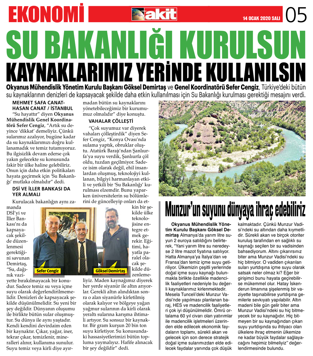 Okyanus Mühendislik Yönetim Kurulu Başkanı Göksel Demirtaş ve Genel Koordinatörü Sefer Cengiz, Türkiye'deki bütün su kaynaklarının denizleri de kapsayacak şekilde daha etkin kullanılması için Su Bakanlığı kurulması gerektiği mesajını verdi.
