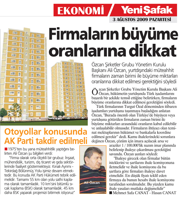 Özcan Şirketler Grubu Yönetim Kurulu Başkanı Ali Özcan, hükümetin yurtdışında Türk işadamlarını başarılı bir şekilde temsil ettiğine belirtirken, firmaların büyüme oranlarına dikkat edilmesi gerektiğini söyledi. Türk firmalarının Turgut Özal döneminden itibaren işadamları yurtdışına taşınmaya başladığını anlatan Özcan, 'Burada önemli olan Türkiye'de büyüyen veya yurtdışına götürülen firmaların zaman birimi ile büyüme miktarları arasındaki oranların kabul edilebilir ve anlaşılabilir olmasıdır. Firmaların ihtiyacı olan teminat mektuplarının hükümet ve bankalarla koordine edilmesi gerekir' dedi. Kamu ihalelerindeki sorunlara değinen Özcan, çözüm için imara açılacak arsa ve araziler 1 / 100.000'lik nazım imar planında belirlenip ihaleye çıkarılması gerektiğini savundu. Özcan şunları söyledi: 'İhaleye girecek olan firmalar bütün isteklerini ve şartlarını ihale komisyonuna iletmelidir ve ihale komisyonu da bu şartlara göre firmaları ihaleye davet etmelidir. En düşük fiyatı teklif eden firmaya da bunun hesabı ihale komisyonu tarafından sorulmalıdır. Bu yüzden kamu ihale yasaları mutlaka değişmelidir'