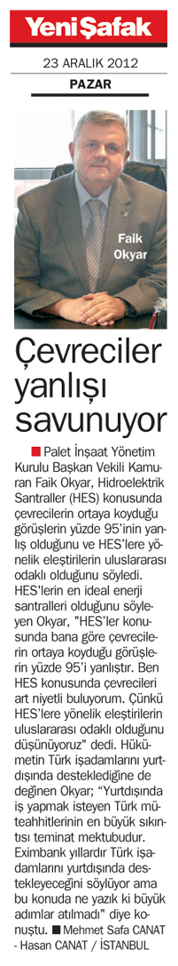 Palet İnşaat Yönetim Kurulu Başkan Vekili Kamuran Faik Okyar, Hidroelektrik Santraller (HES) konusunda çevrecilerin ortaya koyduğu görüşlerin yüzde 95'inin yanlış olduğunu ve HES'lere yönelik eleştirilerin uluslararası odaklı olduğunu söyledi.