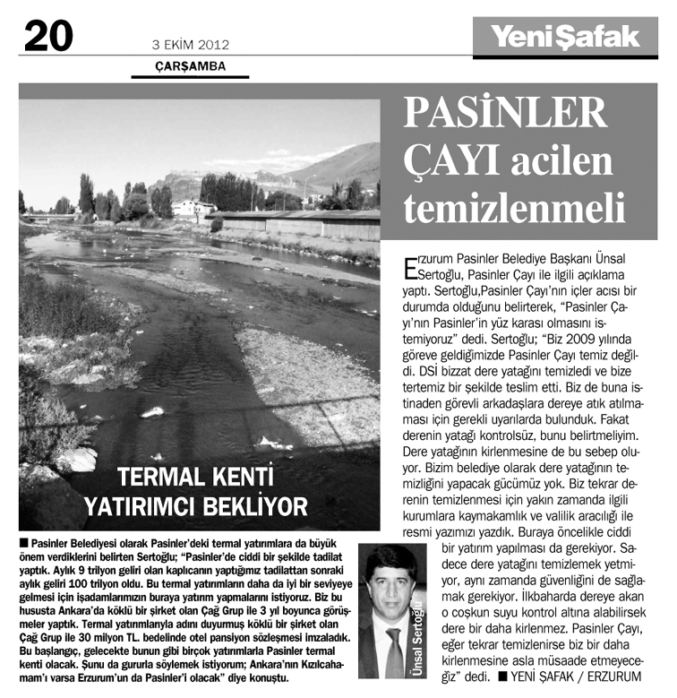 Pasinler'in içler acısı durumundaki Pasinler Çayı ile ilgili açıklamalar yapan Ünsal Sertoğlu; 'Biz 2009 yılında göreve geldiğimizde Pasinler Çayı temiz değildi. DSİ bizzat dere yatağını temizledi ve bize tertemiz bir şekilde teslim etti. Biz de buna istinaden görevli arkadaşlara dereye atık atılmaması için gerekli uyarılarda bulunduk. Fakat derenin yatağı kontrolsüz, bunu belirtmeliyim. Dere yatağının kirlenmesine de bu sebep oluyor. Bizim belediye olarak dere yatağının temizliğini yapacak gücümüz yok. Biz tekrar derenin temizlenmesi için yakın zamanda ilgili kurumlara kaymakamlık ve valilik aracılığı ile resmi yazımızı yazdık. Buraya öncelikle ciddi bir yatırım yapılması da gerekiyor. Sadece dere yatağını temizlemek yetmiyor, aynı zamanda güvenliğini de sağlamak gerekiyor. İlkbaharda dereye akan o coşkun suyu kontrol altına alabilirsek dere bir daha kirlenmez. Pasinler Çayı, her ilçeye nasip olmayan bir su yatağıdır. Şu an ki durumu gerçekten içler acısıdır. Biz Pasinler Çayı'nın Pasinler'in yüz karası olmasını istemiyoruz. Pasinler Çayı, eğer tekrar temizlenirse biz bir daha kirlenmesine asla müsaade etmeyeceğiz' dedi.