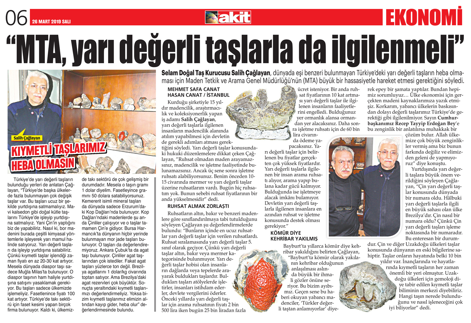 "MTA, yarı değerli taşlarla da ilgilenmeli" Yeni Akit Gazetesi / 26.03.2019 Selam Doğal Taş Kurucusu Salih Çağlayan, dünyada eşi benzeri bulunmayan Türkiye'deki yarı değerli taşların heba olmaması için Maden Tetkik ve Arama Genel Müdürlüğü'nün (MTA) büyük bir hassasiyetle hareket etmesi gerektiğini söyledi. Kurduğu şirketiyle 15 yıldır madencilik, araştırmacılık ve koleksiyonerlik yapan iş adamı Salih Çağlayan, yarı değerli taşlarla ilgilenen insanların madencilik alanında atılım yapabilmesi için devletin de gerekli adımları atması gerektiğini söyledi. Yarı değerli taşlar konusundaki hukuki düzenlemelere dikkat çeken Çağlayan, "Ruhsat olmadan maden arayamazsınız, madencilik ve işletme faaliyetinde bulunamazsınız. Ancak üç sene sonra işletme ruhsatı alabiliyorsunuz. Benim önceden 10-15 civarında mermer ve yarı değerli taşlar üzerine ruhsatlarım vardı. Bugün hiç ruhsatım yok. Bunun sebebi ruhsat fiyatlarının bir anda yükselmesidir" dedi. Ruhsat almak zorlaştı Ruhsatların altın, bakır ve benzeri madenlere göre sınıflandırılmaya tabi tutulduğunu söyleyen Çağlayan şu değerlendirmelerde bulundu: "Bunların içinde en ucuz ruhsatlar yarı değerli taşlar için verilen ruhsatlardı. Ruhsat sıralamasında yarı değerli taşlar 5. sınıf olarak geçiyor. Çünkü yarı değerli taşlar altın, bakır veya mermer kategorisinde bulunmuyor. Yarı değerli taşlar hobisi olan insanların dağlarda veya tepelerde arayarak buldukları taşlardır. Buldukları taşları atölyelerde işletirler, insanları istihdam ederler, devlete vergilerini öderler. Önceki yıllarda yarı değerli taşlar için arama ruhsatının fiyatı 2 bin 500 lira iken bugün 25 bin liradan fazla ücret isteniyor. Bir anda ruhsat fiyatlarının 10 kat artması yarı değerli taşlar ile ilgilenen insanların faaliyetlerini engelledi. Bulduğunuz yer ormanlık alansa ormandan yer alacaksınız. Daha sonra işletme ruhsatı için de 60 bin lira civarında ödeme yapacaksınız. Yarı değerli taşlar için belirlenen bu fiyatlar gerçekten çok yüksek fiyatlardır. Yarı değerli taşlarla ilgilenen bir insan arama ruhsatı alıyor, arama yapıp bulana kadar gücü kalmıyor. Bulduğunda ise işletmeye alacak imkânı bulamıyor. Devletin yarı değerli taşlarla ilgilenen insanlara en azından ruhsat ve işletme konusunda destek olması gerekiyor." Kömür diye kehribar yakılmış Bayburt'ta yıllarca kömür diye kehribar yakıldığını belirten Çağlayan, "Bayburt'ta kömür olarak yakılanın kehribar olduğunun anlaşılması aslında büyük bir ihmali gözler önüne seriyor. Bu bizim ayıbımız. Geçen sene bu haberi okuyan yabancı madenciler, 'Türkler değerli taştan anlamıyorlar' diyerek epey bir şamata yaptılar. Bundan hepimiz sorumluyuz… Ülke ekonomisi için gerçekten madeni kaynaklarımıza yazık etmişiz. Korkarım, yabancı ülkelerin baskısından dolayı değerli taşlarımız Türkiye'de gerektiği gibi ilgilenilmiyor. Sayın Cumhurbaşkanımız Recep Tayyip Erdoğan Bey'e bu zenginlik bir anlatılırsa muhakkak bir çözüm bulur. Allah ülkemize çok büyük zenginlikler vermiş ama biz bunun farkında değiliz ve elimizden geleni de yapmıyoruz" diye konuştu. Yurtdışında yarı değerli taşlara büyük önem verildiğini söyleyen Çağlayan, "Çin yarı değerli taşlar konusunda dünyada bir numara oldu. Hâlbuki yarı değerli taşlarla ilgili en büyük sahası olan ülke Brezilya'dır. Çin nasıl bir numara oldu? Çünkü Çin yarı değerli taşları işleme noktasında bir numaradır. Bu enteresan bir durumdur. Çin ve diğer Uzakdoğu ülkeleri taşlar konusunda dünyanın en eski bilgilerine sahiptir. Taşlar onların hayatında belki 10 bin yıldır var. İnançlarında ve hayatlarında kıymetli taşların her zaman önemli bir yeri olmuştur. Uzakdoğu ülkeleri için gemoloji diye tabir edilen kıymetli taşlar biliminin merkezi diyebiliriz. Hangi taşın nerede bulunduğunu ve nasıl işleneceğini çok iyi biliyorlar" dedi. Kıymetli taşlarımız heba olmasın Türkiye'de yarı değerli taşların bulunduğu yerleri de anlatan Çağlayan, "Türkiye'de başka ülkelerde fazla bulunmayan çok değişik taşlar var. Bu taşları ucuz bir şekilde yurtdışına satmamalıyız. Mavi kalsedon gibi doğal kütle taşlarını Türkiye'de işleyip yurtdışına satmalıyız. Yani Çin'in yaptığını biz de yapabiliriz. Nasıl ki, bor madenini burada çeşitli kimyasal yöntemlerle işleyerek yarı mamul halinde satıyoruz. Yarı değerli taşları da işleyip yurtdışına satabiliriz. Çünkü kıymetli taşlar işlendiği zaman fiyatı en az 20-30 kat artıyor. Mesela dünyada diaspor taşı sadece Muğla Milas'ta bulunuyor. O diaspor taşının ham haliyle yurtdışına satışını yasaklamak gerekiyor. Bu taşları sadece ülkemizde işlemeliyiz. Fasetlenince fiyatı 100 kat artıyor. Türkiye'de takı sektörü için faset kesimi yapan birçok firma bulunuyor. Kaldı ki, ülkemizde takı sektörü de çok gelişmiş bir durumdadır. Mesela o taşın gramı 1 dolar diyelim. Fasetleyince gramını 50 dolara satabiliyorsunuz. Kemererit isimli mineral taşları da dünyada sadece Erzurum'daki Kop Dağları'nda bulunuyor. Kop Dağları'ndaki madenlerde şu anda Çinliler çalışıyor ve o taşlar tamamen Çin'e gidiyor. Bursa Harmancık'ta dünyanın hiçbir yerinde bulunmayan mor jade taşları bulunuyor. O taşları da değerlendiremiyoruz. Ankara Çubuk'ta da agat taşı bulunuyor. Çinliler agat taşlarından çok istediler. Fakat agat taşları yüzlerce ton değil. Brezilya agatlarını 1 dolar/kg civarında toptan satıyor. Ama Brezilya'daki agat rezervleri çok büyüktür. Sonuçta yeraltındaki kıymetli taşlarımızı değerlendirmeliyiz. Yoksa bizim kıymetli taşlarımız elimizin altından kayıp gider, heba olur" değerlendirmesinde bulundu. MEHMET SAFA CANAT - 