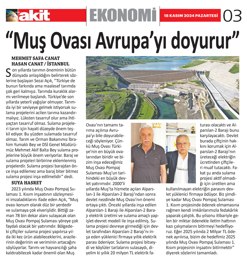Seza İnşaat Yönetim Kurulu Başkanı Sezai Açık, DSİ'nin uhdesinde Malatya'da ve Muş'ta inşa ettikleri sulama projelerinin Türkiye'de tarımı şaha kaldırabilecek kadar önemli olduğunu ve Avrupa'yı dahi doyurabileceğini söyledi.